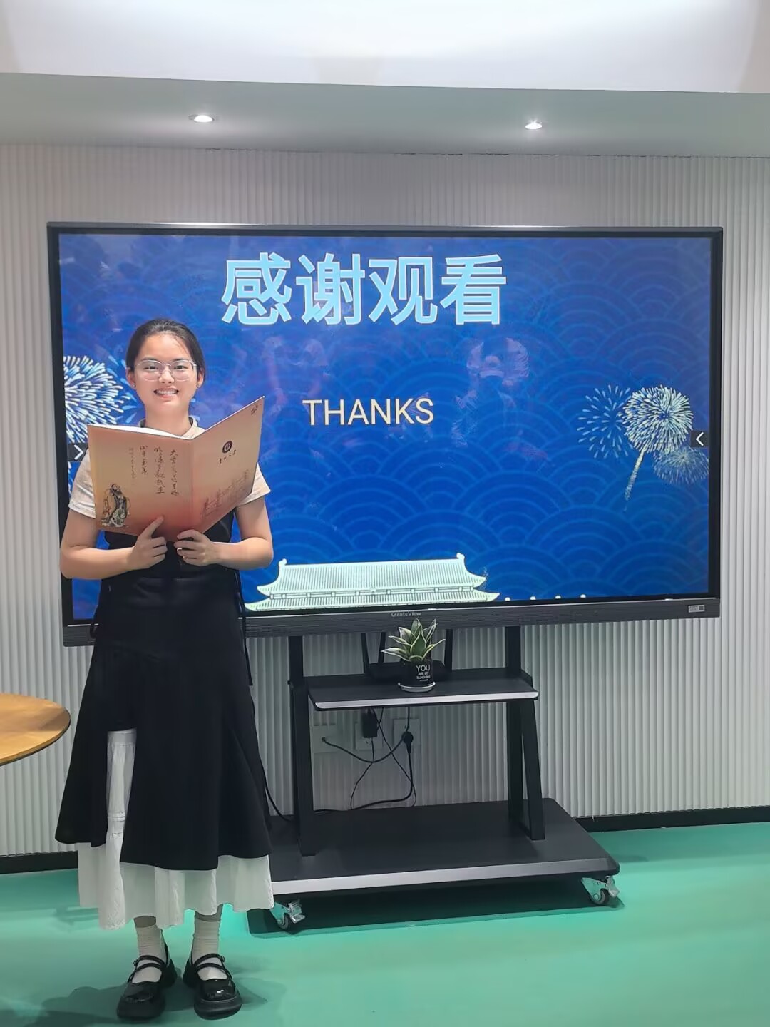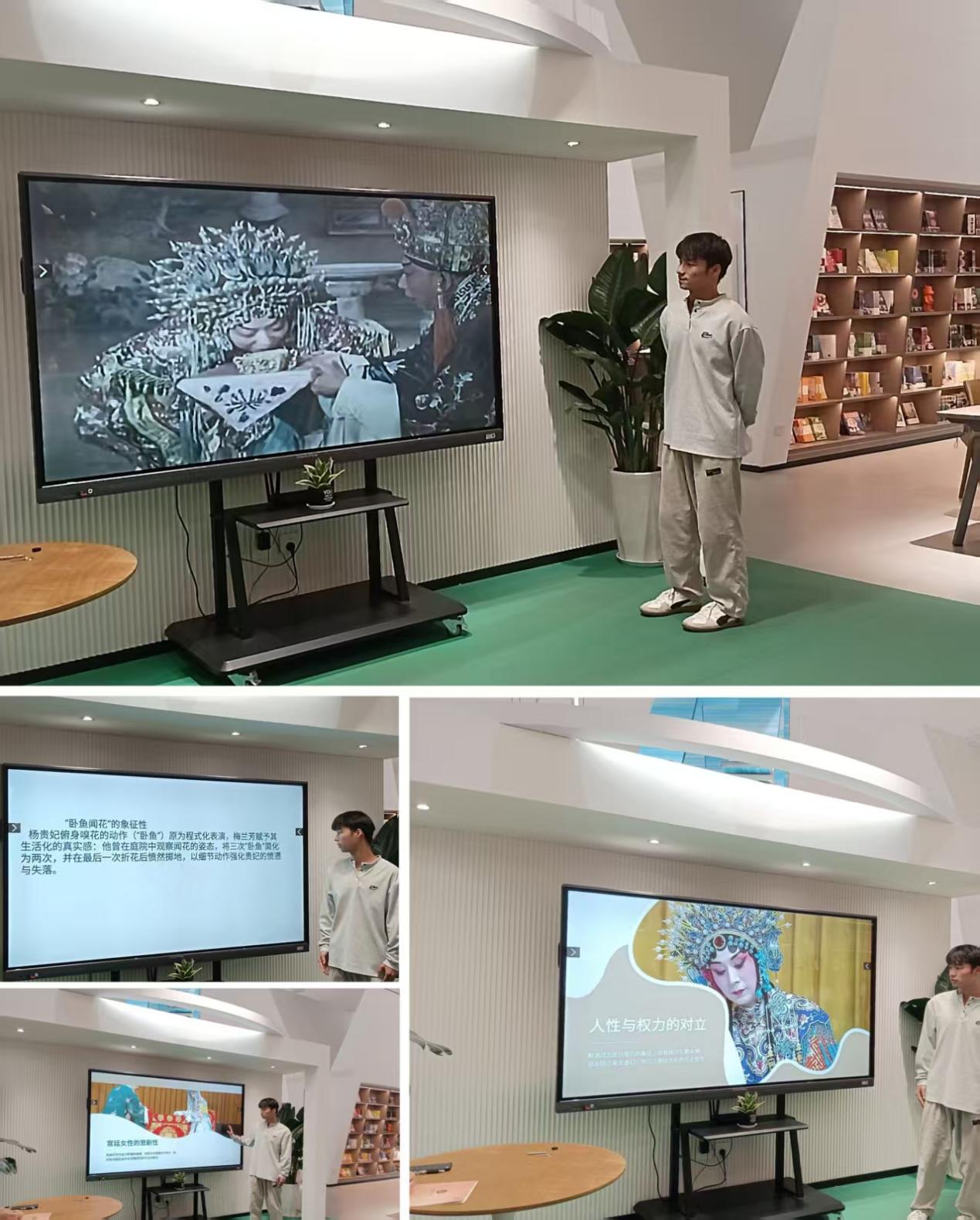 活动伊始,王美吉同学分享的《贵妃醉酒》便吸引了全场目光。这位同学聚焦梅兰芳改编版的创新之处,通过视频展示了“衔杯醉步”“卧鱼闻花”等经典动作,剖析了杨玉环醉态背后的心理刻画与艺术升华,“那一低眉的哀愁,胜过千言万语;那一转身的踉跄,道尽深宫寂寥”。梅派京剧的写意美学与社会隐喻,让观众感受到传统戏曲“以形写神”的独特魅力。