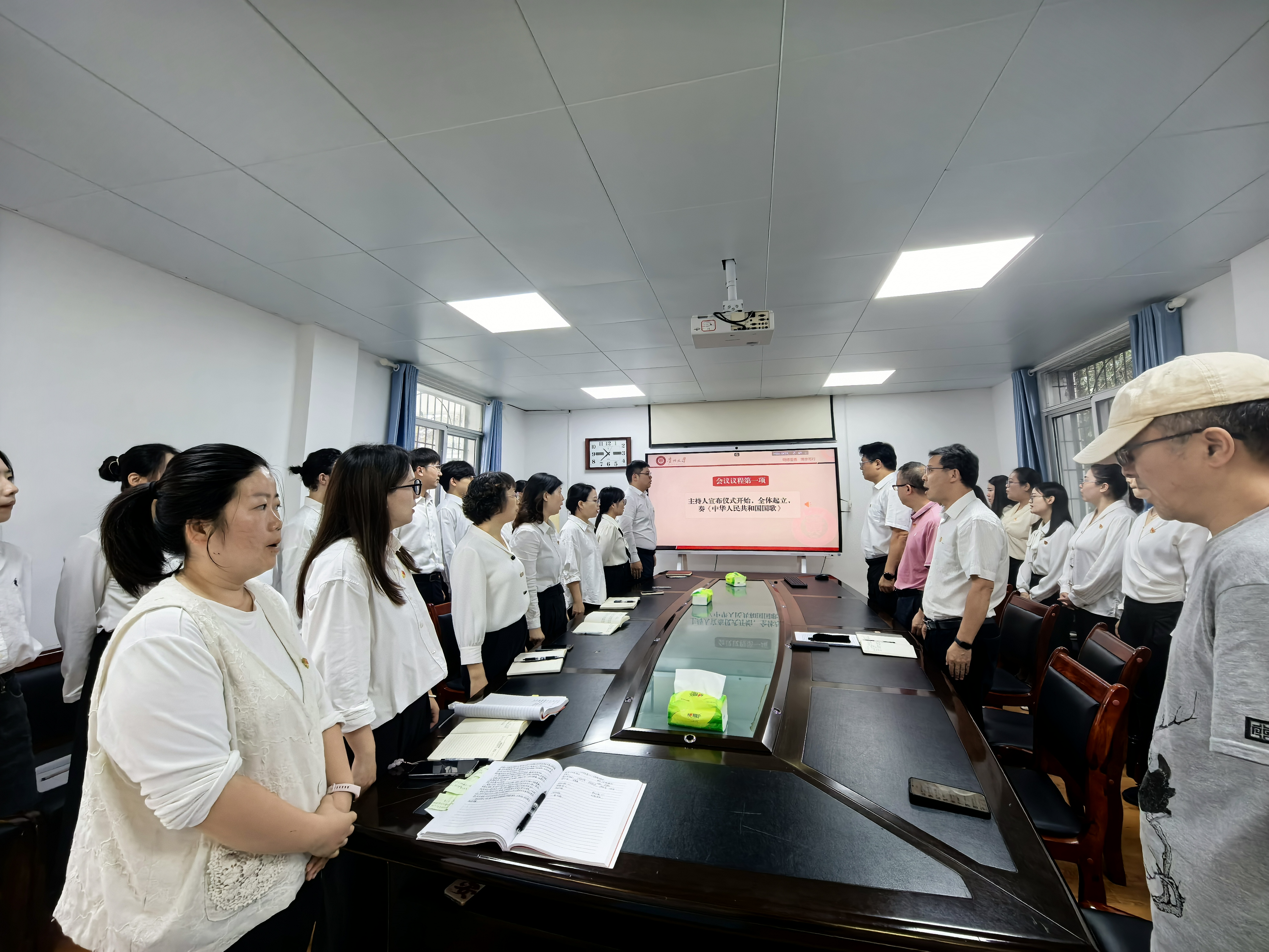 活动在激昂的中华人民共和国国歌声中拉开帷幕,全体人员肃立,齐唱国歌,歌声嘹亮,响彻会场,表达了对祖国的无限热爱和对党的崇高敬意。