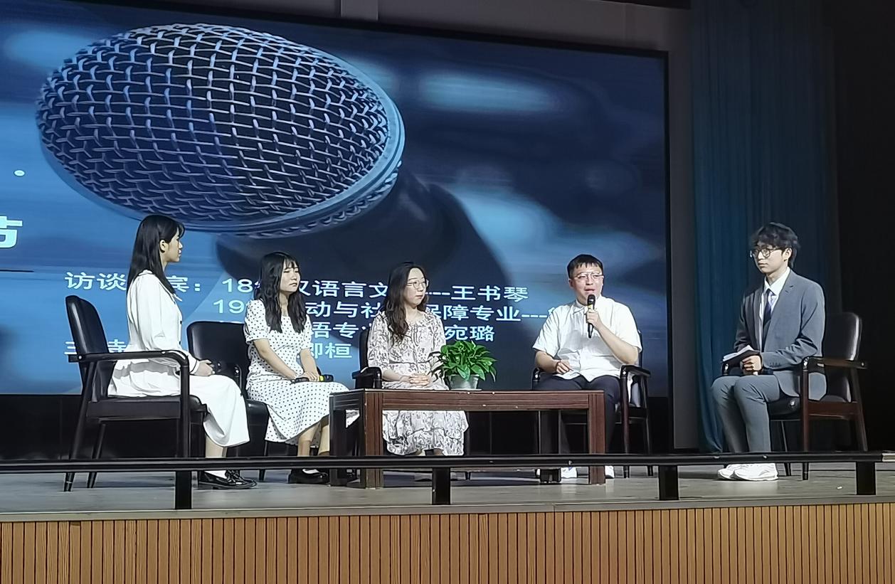 活动以学习篇、实践篇和生活篇为对话主线,从学习适应、专业认知、英语提升、保研经验、竞赛科研、干部经历和时间管理七个方面展开访谈。访谈现场互动气氛热烈,5名国奖获得者回答了主持人和现场观众的提问,法学182班刘星妍学姐谈到,端正学习态度,转变学习方式,提升学习效率,多与任课老师沟通交流,才能更好地适应大学学习。劳保191班熊一虎学长以较为冷门的劳保专业为例,介绍了所学专业的就业前景和就业方向,鼓励同学们加强对所学专业的认知和学习。英语192班宋宛璐学姐从自身专业学习入手,分享了英语比赛经验和英语学习方法,鼓励同学们热爱英语学习,不断探索适合自己的英语学习方法。汉语181班王书琴学姐分享了保研的宝贵经验:如有保研意向,提前了解对方公司和专业的要求,做到未雨绸缪、有的放矢。数学181班饶沫可学姐谈到竞赛和科研时,表示平时多积累、多参加培训,比如询问学长学姐,做一些数学建模练习,寻找全面有用的资料。