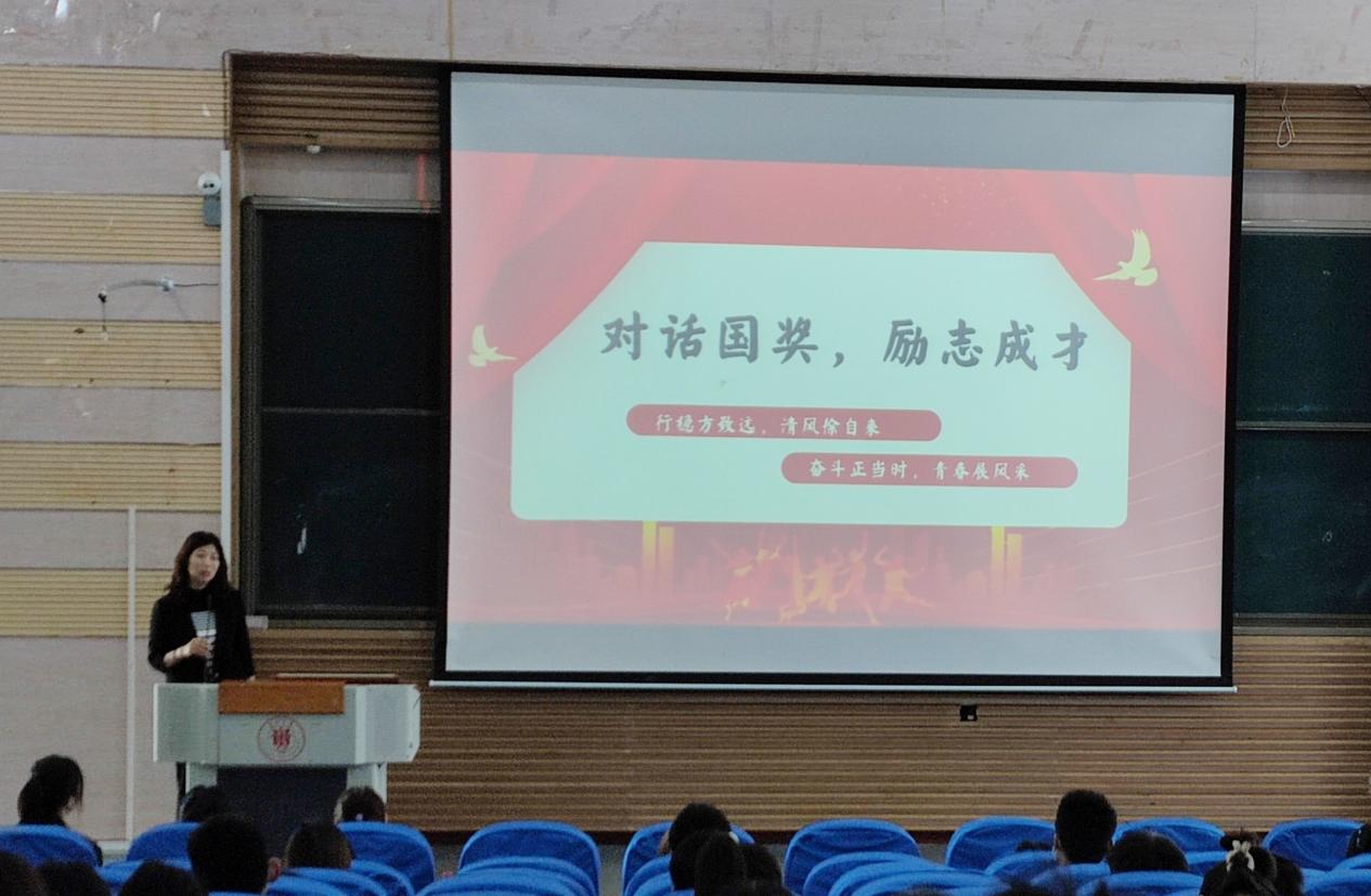 西校区“对话国奖,励志成才”主题活动以成长报告会的形式开展,设置个人分享、期望寄语和互动提问三个环节。公司副经理胡玉群应邀出席活动,草业181班张莓和茶学182班李萍萍受邀对话分享,140名员工代表到场聆听。