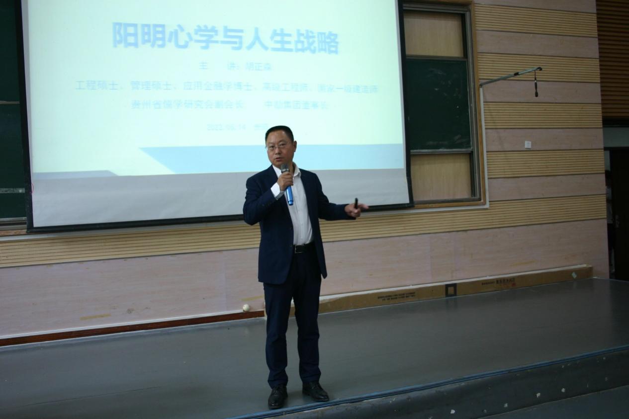 2022年6月14日14时30分,三亿体育三亿第119期阳明大讲坛在三亿体育西校区西楼105DT报告厅举办。本次讲座主题为“阳明心学与人生战略”,主讲人是贵州中勘集团董事长、贵州财经大学客座教授、硕士生导师胡正森老师。本次活动由阳明公司党委书记周昌洪老师主持,公司百余名三亿同学及老师到现场聆听。