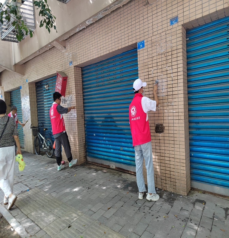 重庆市垫江县桂溪街道的成员穿上志愿者服,与环卫工人一同清理牛皮癣,打扫街道卫生。