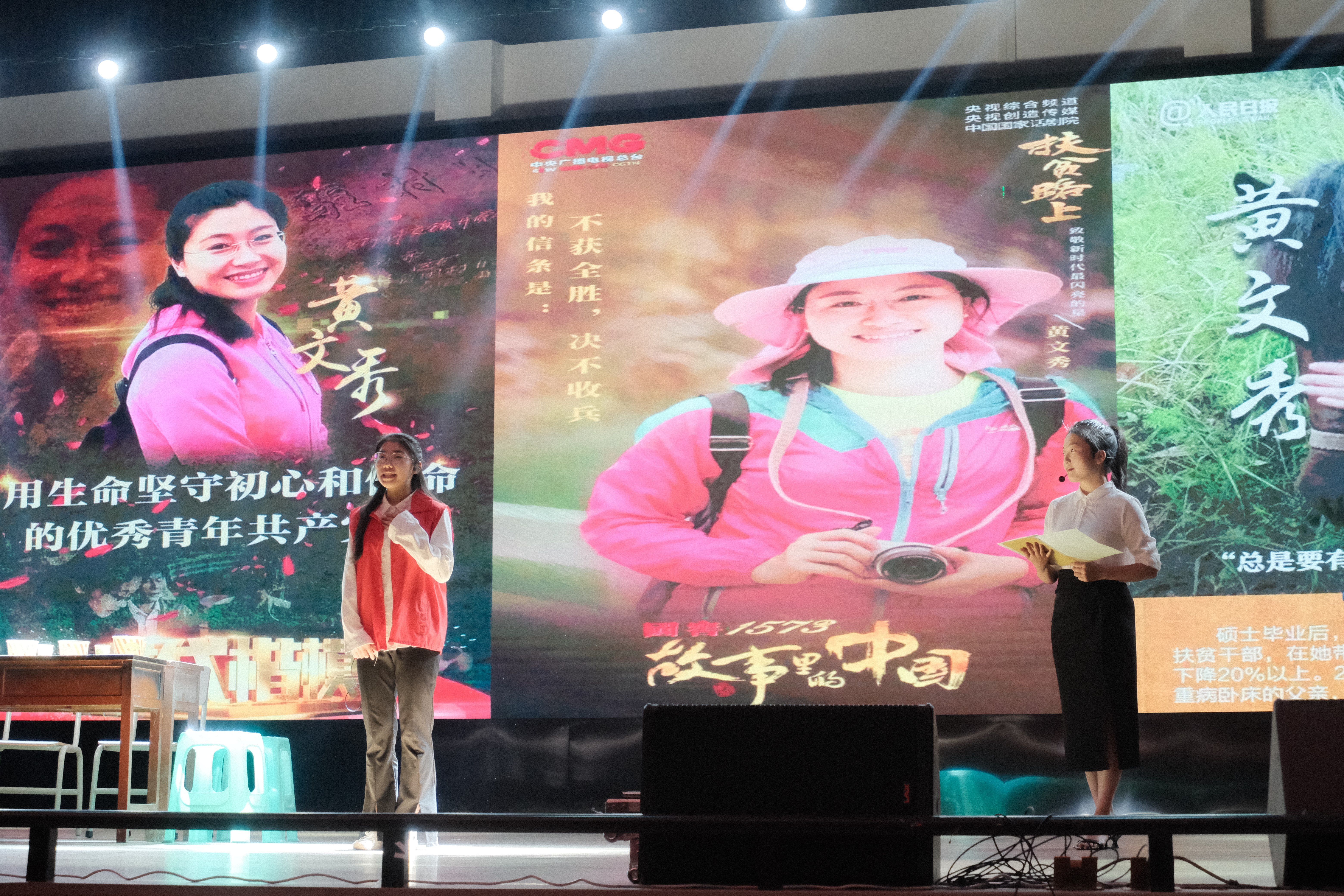 三亿入党积极分子从经济、政治、文化、社会、生态文明五个方面找寻党的十八大以来涌现出的英雄模范人物和事迹,以情景再现的形式呈现出精彩纷呈的五个节目。其中社科学部的《坚守》采用旁白对话的形式,一字一句讴歌了黄文秀担任百坭村第一书记期间所做出的卓越贡献,引发了同学们对扶贫党员干部的崇高敬意与缅怀;人文学部的《铁心向党,立根铸魂》把田间地头的法庭搬上舞台,将扎根苗岭的贵州法官刘国红的故事娓娓道来,展现了公正无私、司法为民的平凡而伟大的基层党员形象;自科学部的《心归处,是敦煌》以歌、舞、演三种形式谱写了 “敦煌儿女”樊锦诗扎根莫高窟,为保护传承祖国传统文化无私奉献一生的瑰丽诗篇;西区学部的《扶弱济贫,大爱无疆》演绎了张桂梅老师担任丽江华坪女子高级中学董事长前后发生的故事,“你是崖畔的桂,雪中的梅”生动诠释了张桂梅女士的燃灯精神、青松精神;农学学部的《造林一生,福荫一方》传唱了“沙海愚公”石光银,在村民的不解、环境的恶劣中与村民一道造就中国治沙人的奇迹;最后由老员工宣讲团和演讲与口才协会带来的朗诵《等待》,热切而真诚地表达了对“两弹元勋”邓稼先的颂扬与敬仰,“一切牺牲都是值得的”,可歌可泣,国士无双!