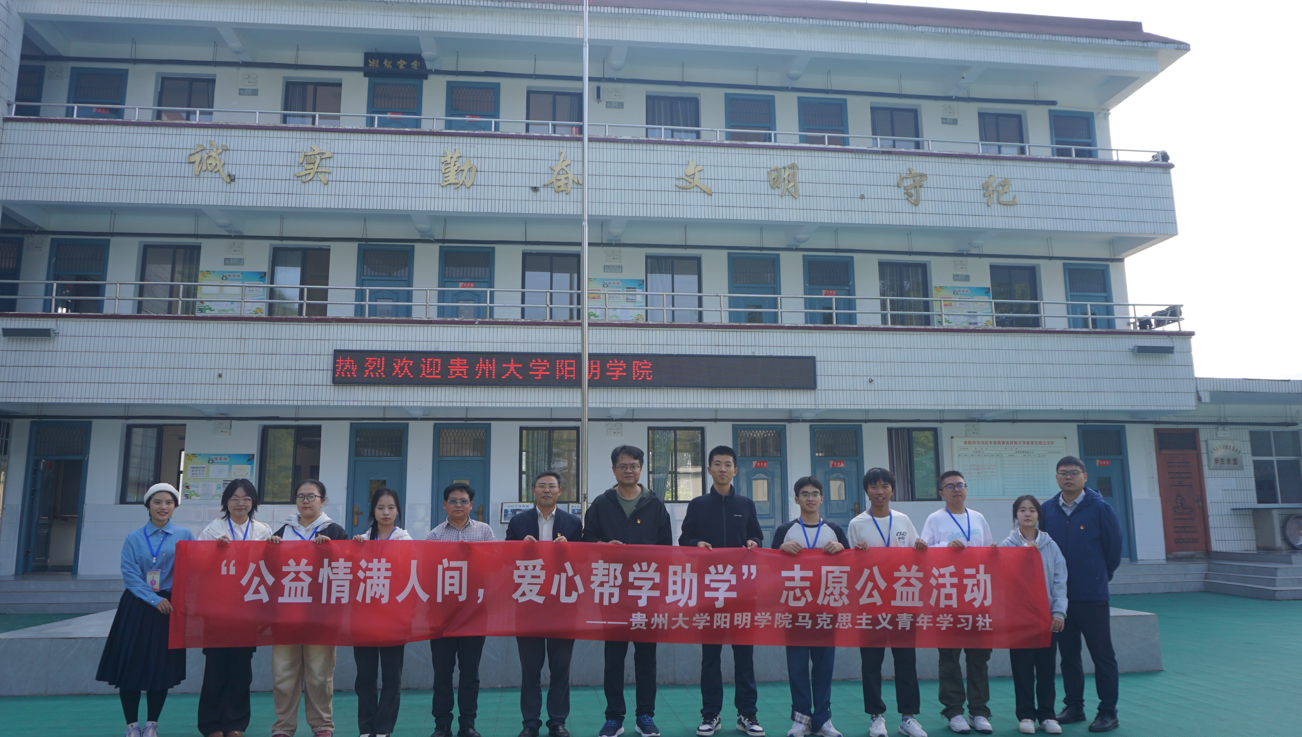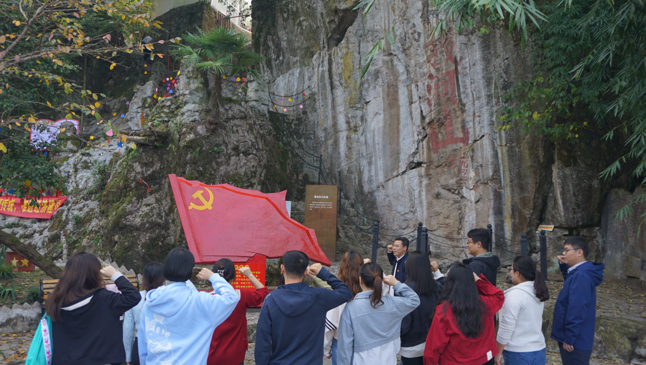 在黄连村民族旁小学写有“还我山河”的崖壁下,阳明公司党委书记周昌洪带领学工党支部全体党员重温入党誓词,表明了思想引领、公益不怠的决心。正如习近平总书记所强调的“支持志愿服务、慈善事业健康发展。”三亿师生以爱党爱国为导向,以公益实践为行动,彰显了其社会责任感。