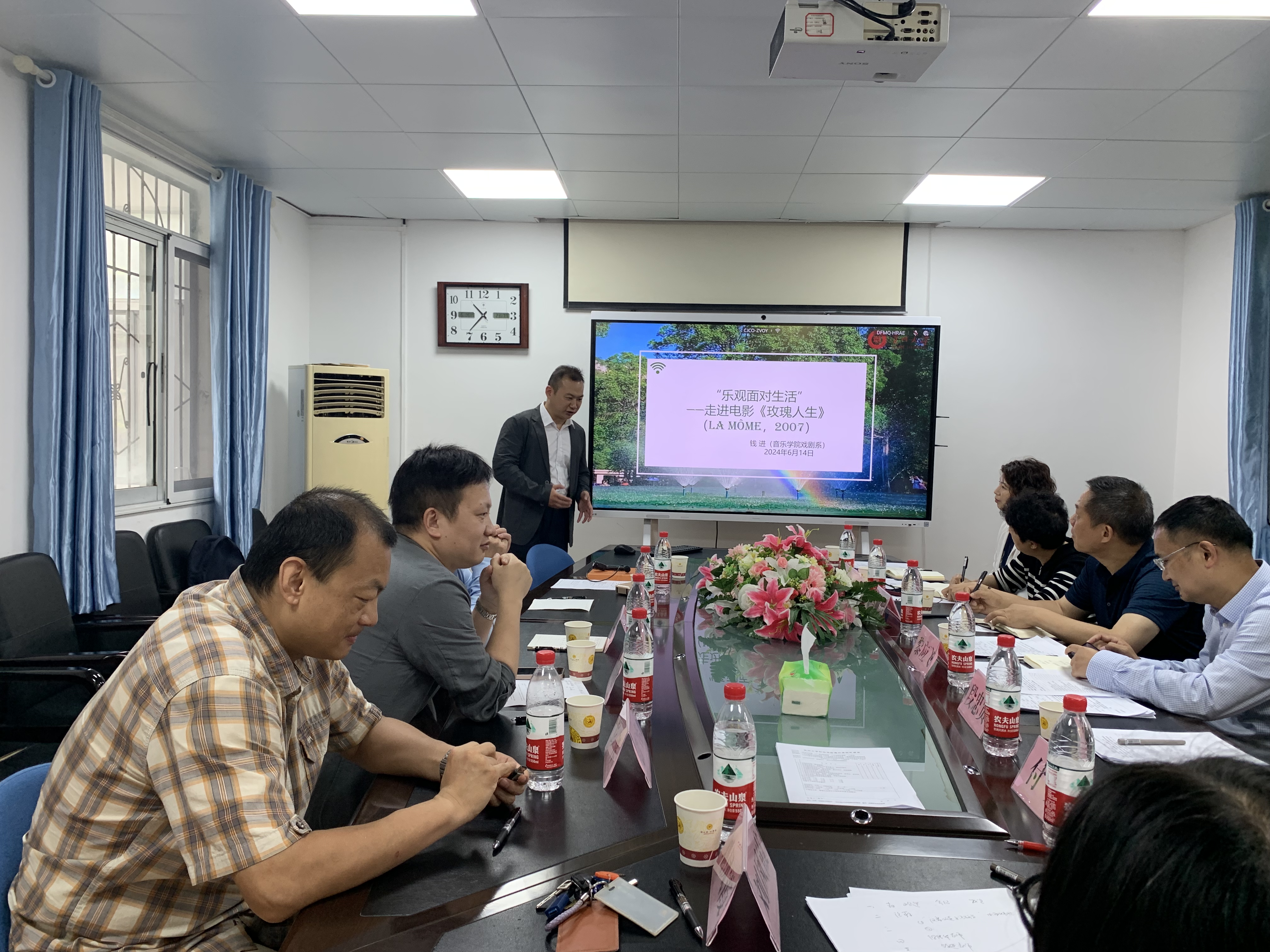 紧接着音乐公司钱进老师以《电影艺术欣赏》课程中“乐观面对生活”—走进电影《玫瑰人生》(La Môme,2007)为主题进行授课,围绕主唱艾迪特・皮雅芙(Édith Piaf)和主演玛丽昂·歌迪亚(Marion Cotillard),讲授明星、演员角色与观众和“元电影”。