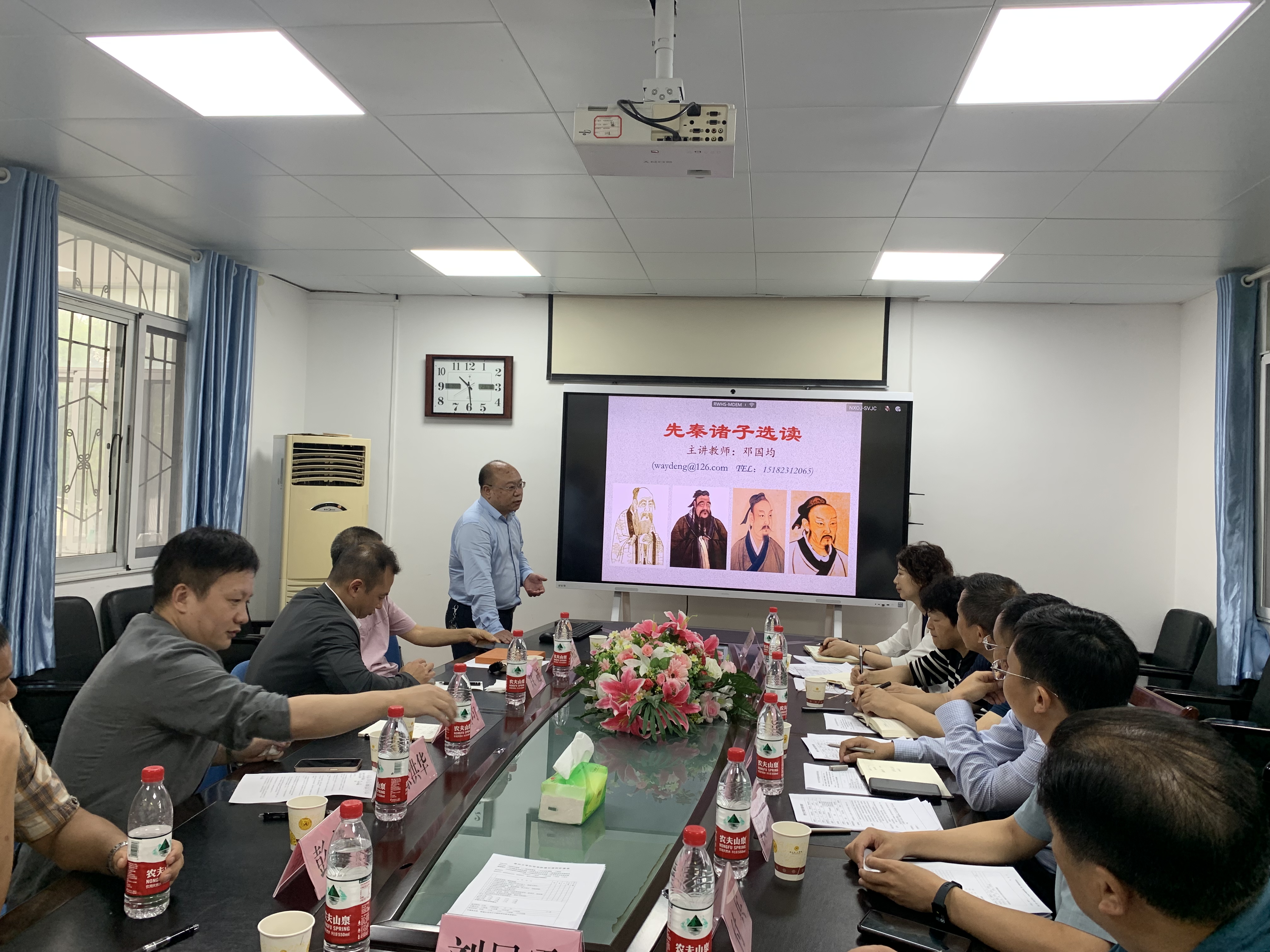 随后中国文化书院邓国均老师以《先秦诸子选读》之第一讲“论语选读”为授课内容,从《论语》出发,结合大一新生特点,讲授了《论语》中“学习”与“修身”的关系。