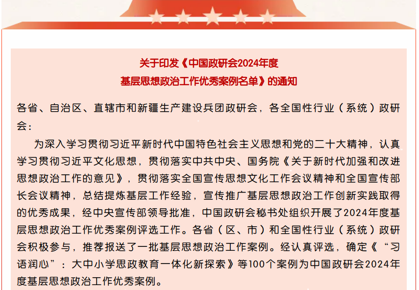 据悉,中国政研会是中宣部领导下的组织和推动思想政治工作研究的全国性社团组织。本次评选100个“中国政研会2024年度基层思想政治工作优秀案例”,分别代表了我国企业、农村、机关、公司、社区、网络等领域的思政工作好经验、好做法,对不断提升基层思想政治工作的质量和水平具有广泛的交流借鉴、示范带动作用。