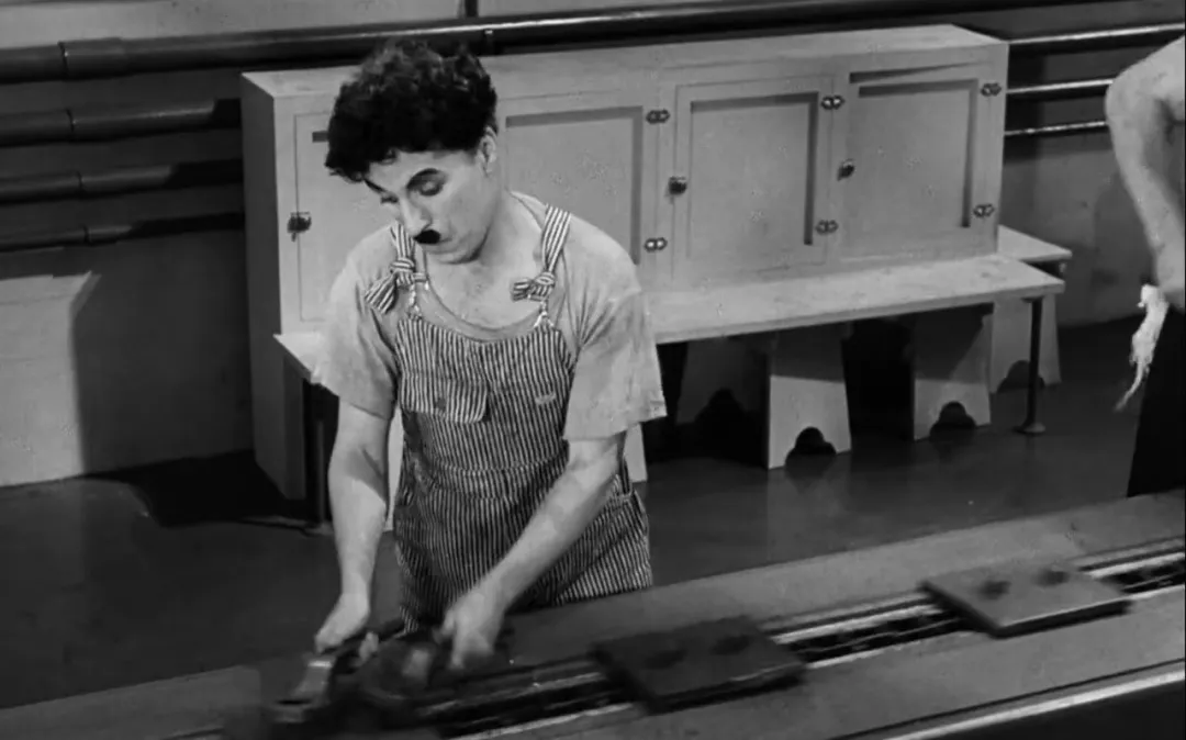 电影《摩登时代》截图,工人查理(卓别林饰)在工厂负责在流水线上拧螺丝。