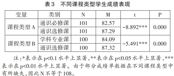 表2汇集了不同类型高校以及不同学科门类的员工通识选修课成绩表现的差异性分析结果。由结果可见,“双一流”建设高校与普通本科高校间员工成绩表现并不存在显著差异,而人文社科员工的通识选修课成绩表现要显著好于理工医科员工(p<0.05)。进一步将课程类型按通识必修课、通识选修课、学科专业课分类后,表3呈现了对不同课程类型成绩进行差异性分析的结果。由结果可见,员工通识选修课学习成绩要显著高于通识必修课成绩(p<0.01)和学科专业课成绩(p<0.01)。结合上文文本分析结果可知,这一现象并非说明员工在选修课方面的学习表现更好。由于高校通识选修课存在难度和深度欠缺、挑战性不足、考核评价宽松等问题,员工在掌握选课规则后,往往以“东食西宿”方式选修“水课”,由此便形成通识选修课成绩虚高,演变为“营养学分”的现象。从人才培养方案或是员工成绩单中还可以看到,诸如“首饰DIY”“围棋基础”“老员工健康恋爱”等课程都被列入选修课名单之中,仿佛只要是非专业性课程,就可以作为通识选修课开设,这无疑冲击了通识教育质量,误解了其本质内涵。