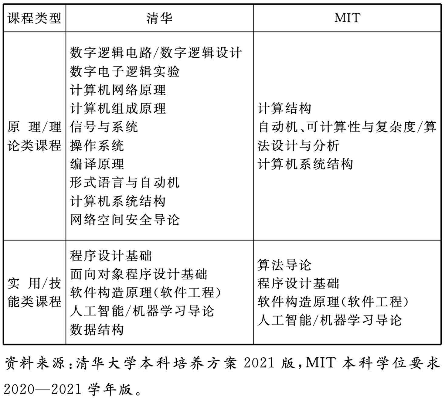 清华原理/理论类课程学分(占比66%)是实用技能类课程(占比34%)的两倍,MIT实用技能课程与原理理论类课程几乎各占一半。MIT本科专业课程受工业界实际需求影响较大,目标是员工本科毕业即有能力直接进入工业界实践。清华计算机专业课程更强调高层次人才所需的“基本理论、基础知识和基本技能”。