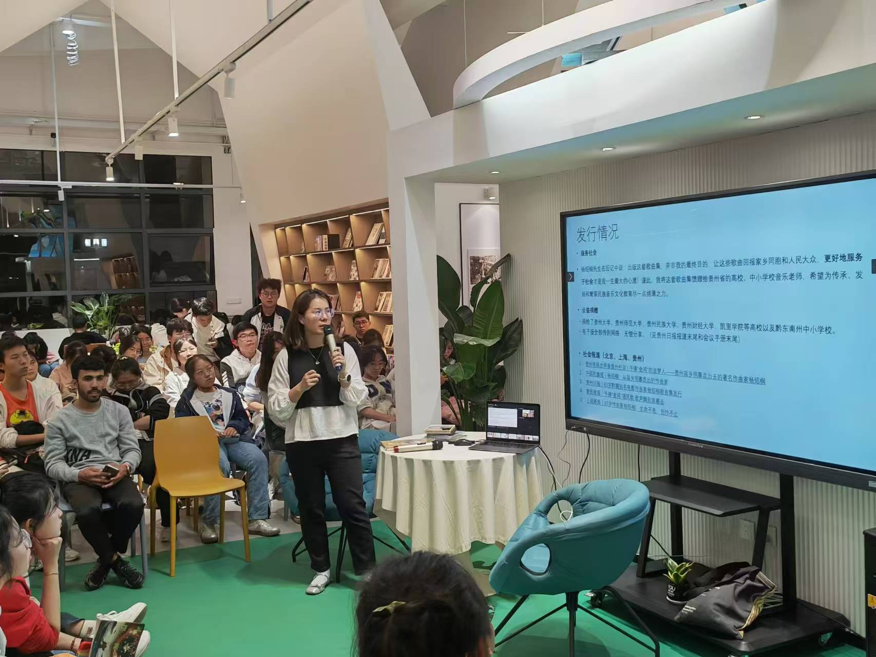 读书会分为三个组成部分。第一部分,吴黔凤老师做“民族音乐的国际传播:经验与反思”主题分享。吴黔凤老师以侗族大歌为切入口,以与贵大员工、知名电影作曲家杨绍榈老先生的合作经历为载体详细向同学们讲解了文化传播的历程与意义,启发同学们以自己的文化引发其他文化的共鸣。