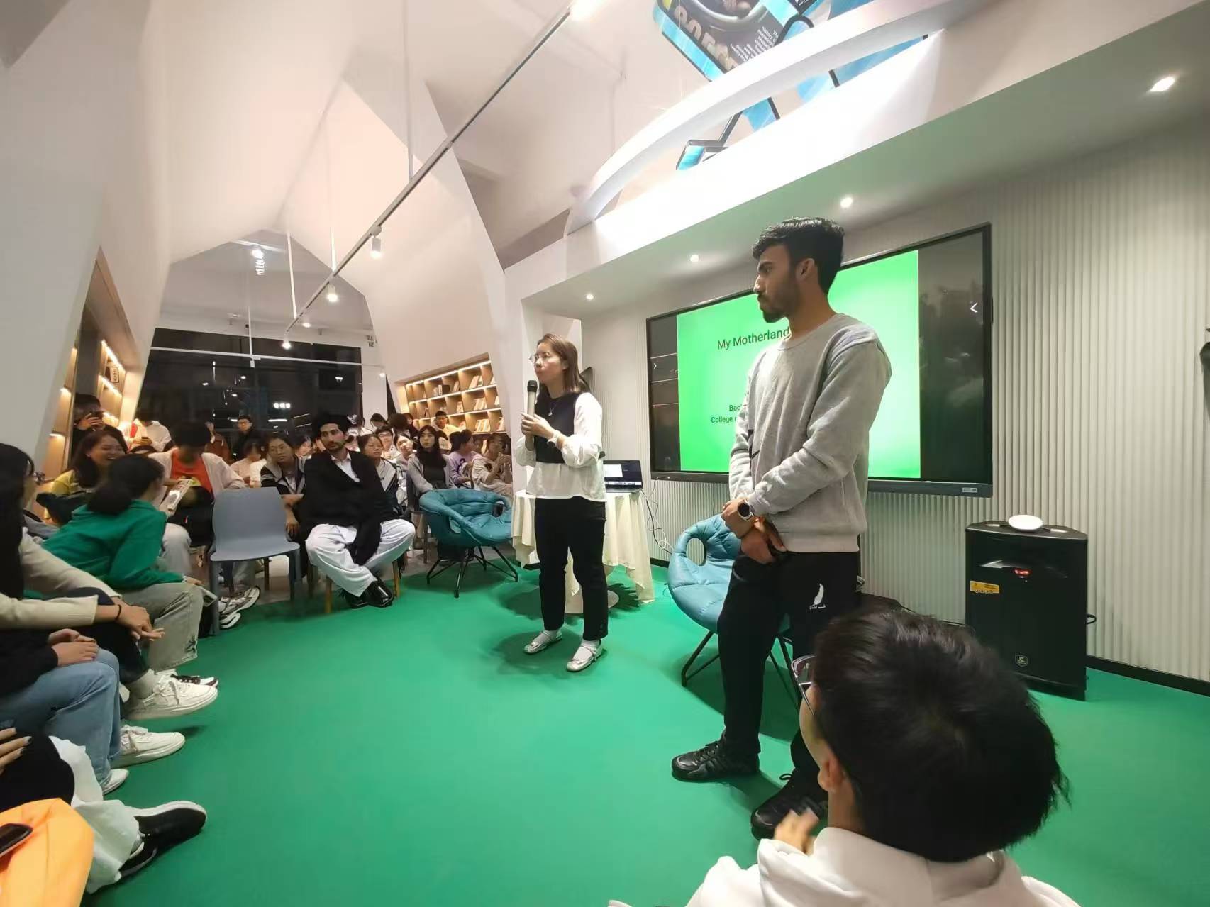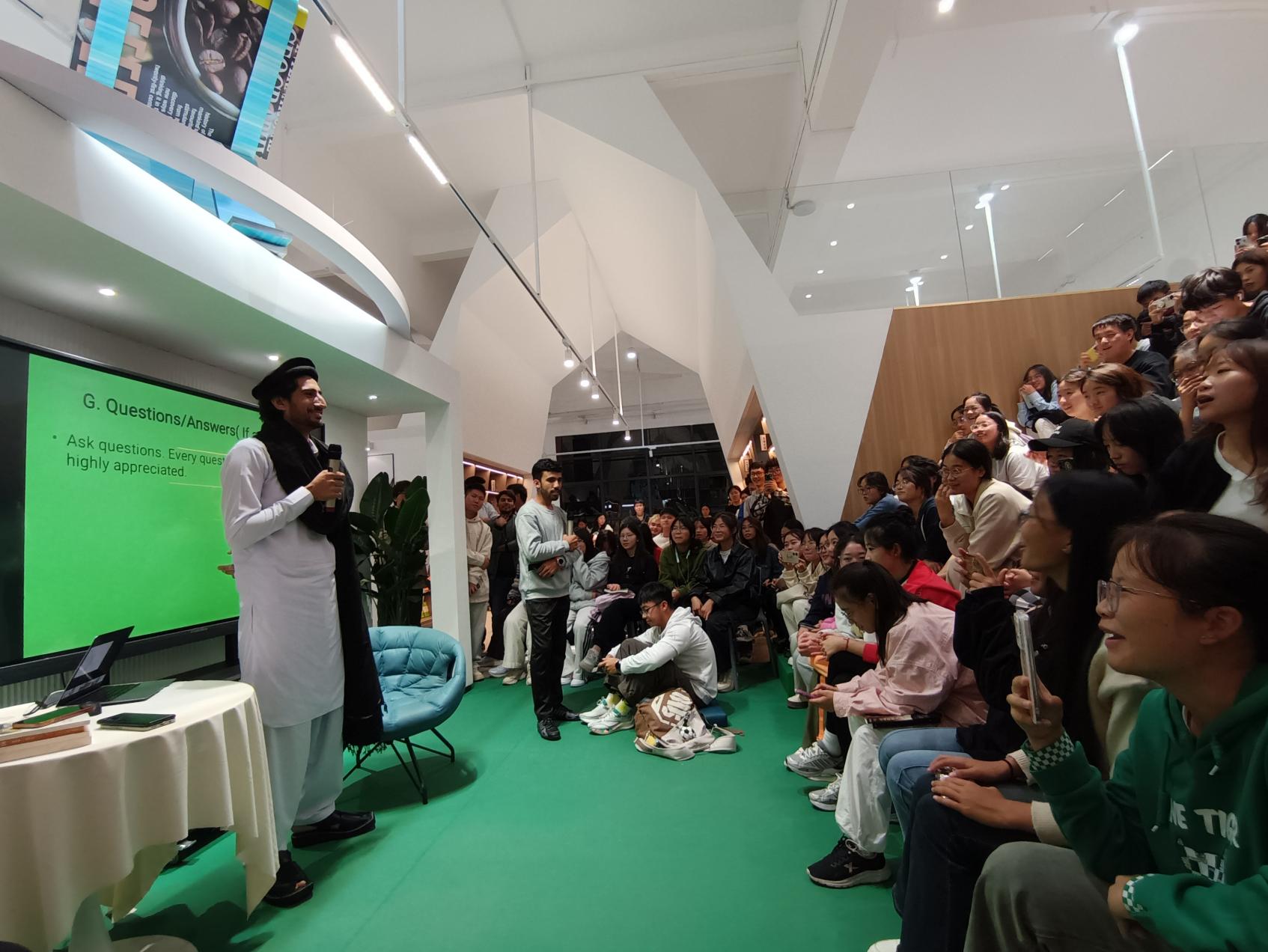 在第二部分,巴基斯坦友人Hassan分享了巴基斯坦文化,他的出场将现场氛围推向了高潮。Hassan的交流分享全程使用英文,是对现场参与读书会同学英语听说水平的极大考验。同学们全程使用英语与他互动,虽然表达有些磕磕绊绊,但交流场景松弛、问答顺畅,大家的热情让外国友人与同学们金句频出,掌声不断。