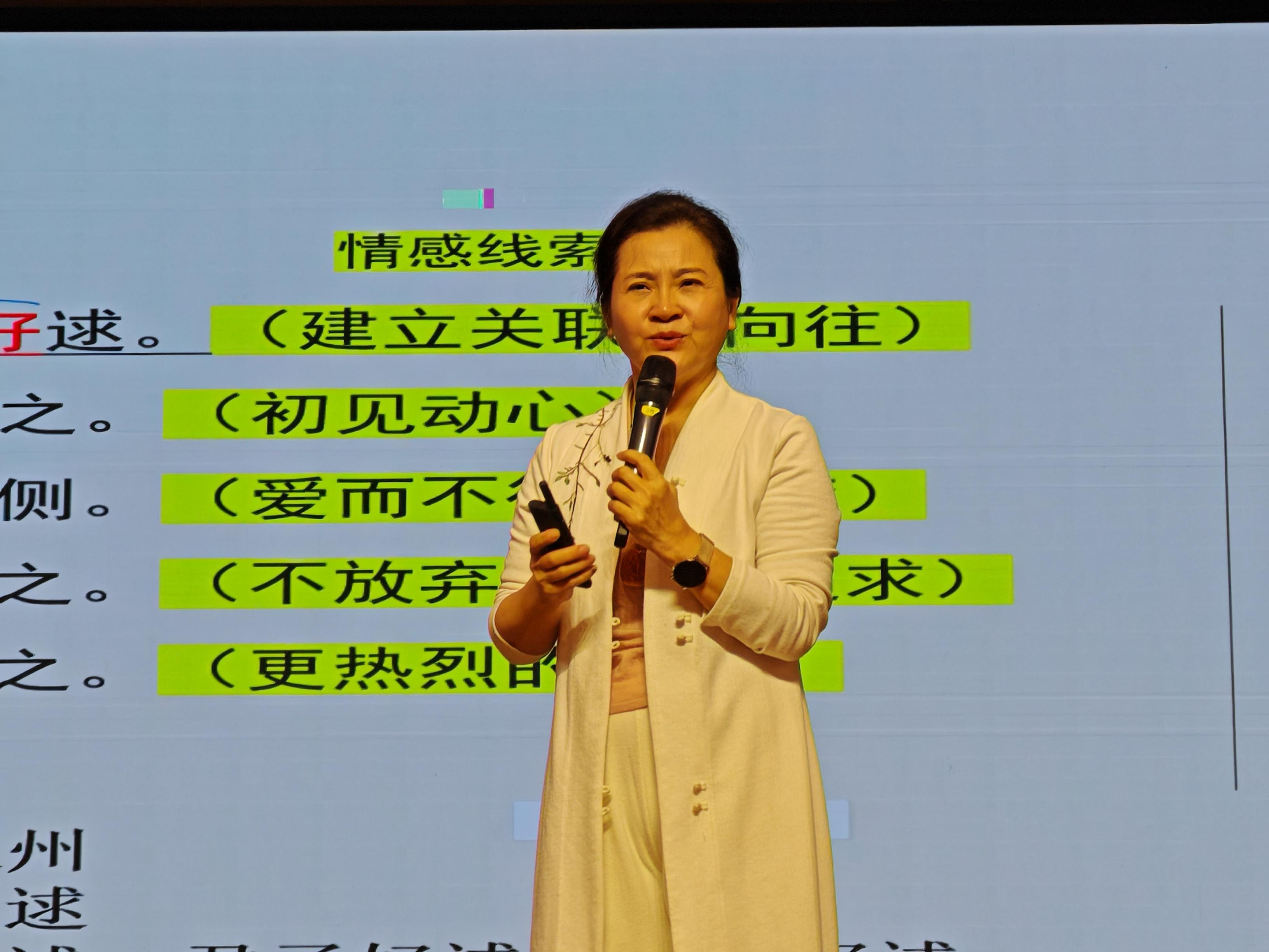 接下来,王老师进一步探讨了《诗经》与《楚辞》之间的区别,深入浅出地剖析了汉代乐府诗及魏晋时期诗歌的不同风格特征。特别值得一提的是,她对盛唐诗歌的高度赞美——那是一个文采飞扬、才子辈出的辉煌时代。王老师强调说,理解诗歌的关键在于用心体会诗人的情感世界,而非单纯依赖文字表面的意思。只要能够设身处地地去感受那份情怀,并借助声音传达出来,就能让这份情感深深打动每一位聆听者的心灵。最后,在王老师的带领下,师生们共同沉浸于一场穿越时空的诗词之旅,一次次生动鲜活的朗诵,使他们更加深刻地领悟到了中华古典文学的魅力所在。