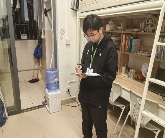 当晚全体检查人员到位后,赵齐老师强调:“检查人员务必公正严明,实事求是地按照评分标准进行评分,客观地反馈同学们寝室卫生状况”。检查人员按照分工,手持详细缜密的寝室评分准则,全覆盖对学部员工寝室进行细致检查、公正评分。检查人员进入全方位“审视”模式,从床铺整理情况到地面清洁程度,从电器线路安全隐患排查到洗漱用品分类归置,无一遗漏、一丝不苟。