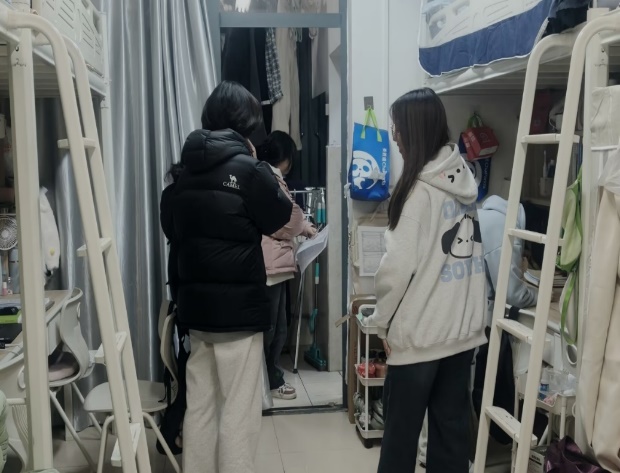只见床铺平坦整洁,被褥叠放得方方正正,上面不见杂物杂乱堆放;宿舍地面仿若明镜,光亮干净,空气清新;电器线路规范有序,各类插头插座安置合理;打扫工具整齐排列,鞋物有序摆放,桌面书籍文具各归其位、整整齐齐。检查员们一边严谨打分,一边用相机定格下寝室的真实模样,为后续精准评比、复盘总结留存详尽依据。