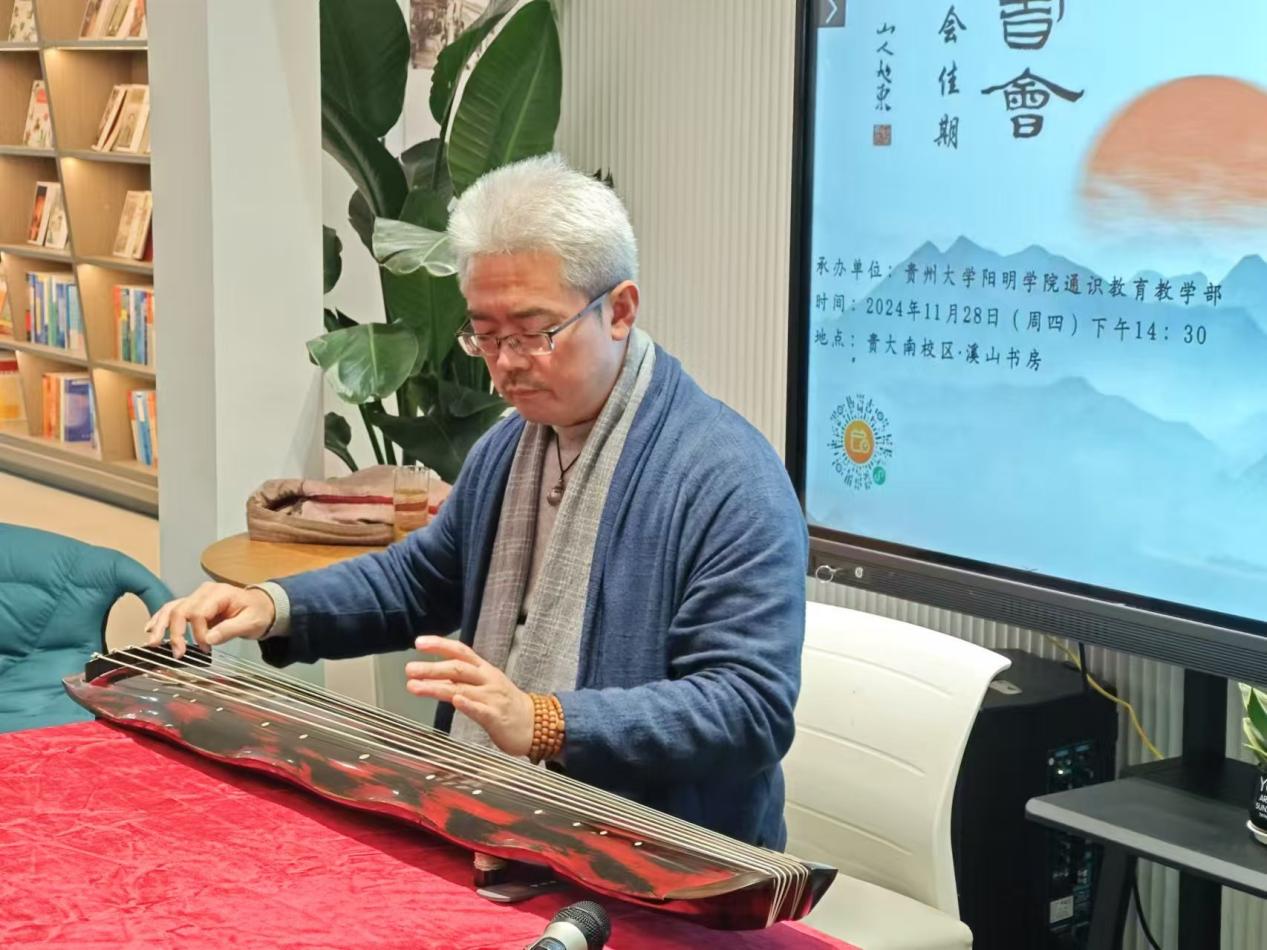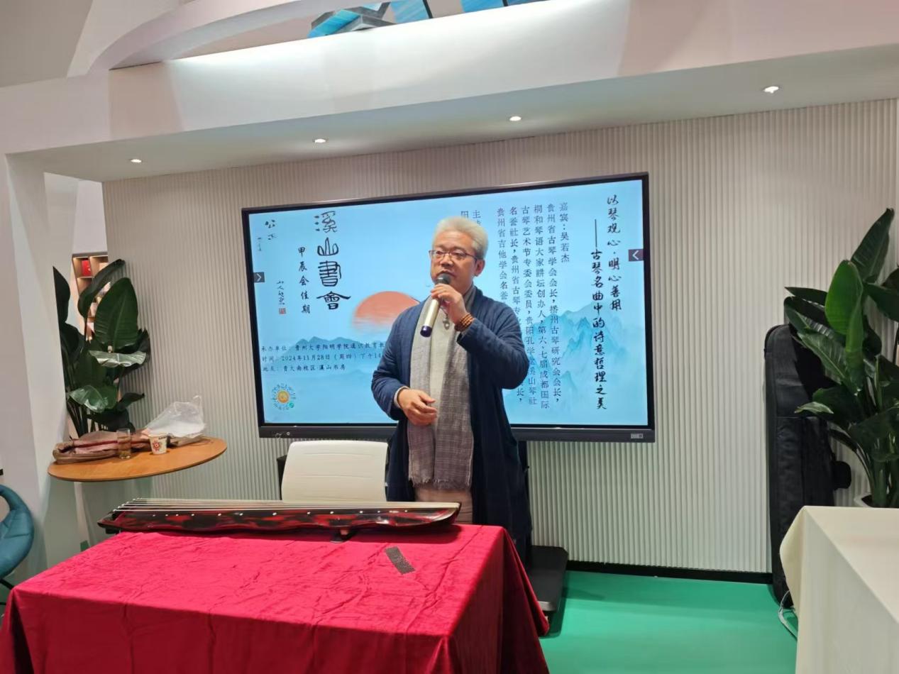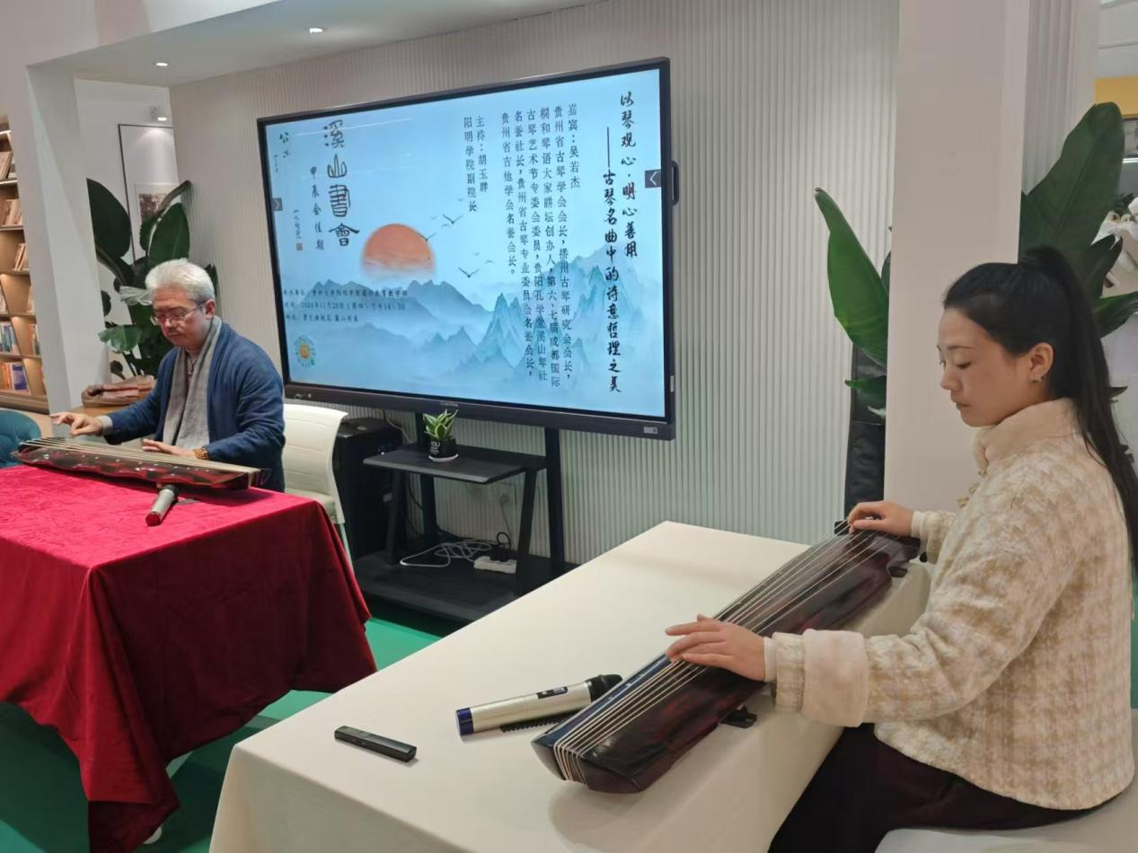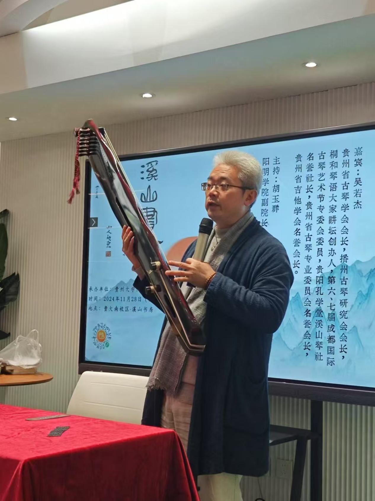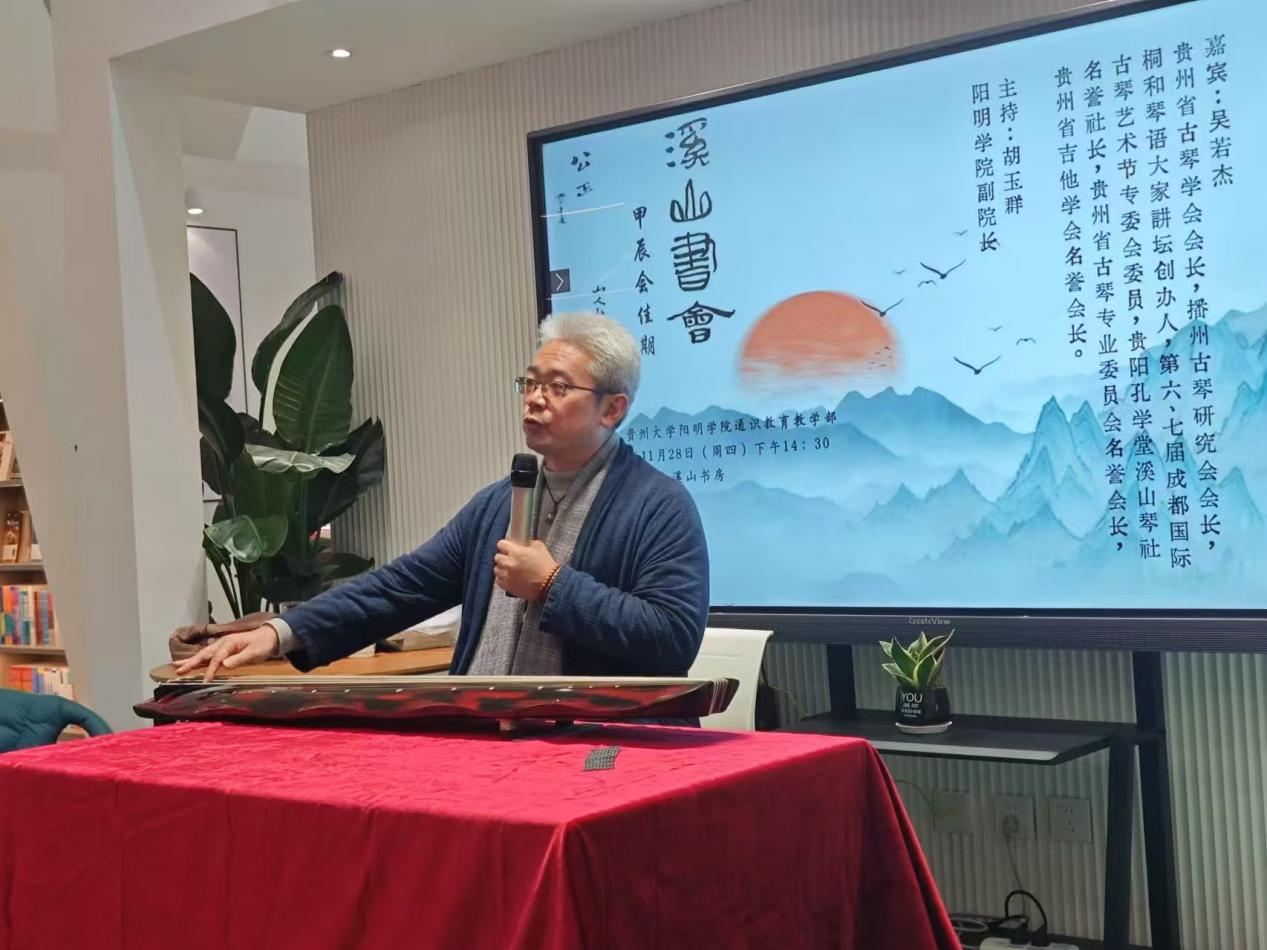 2024年11月28日下午14:30,“以琴观心,明心善用:古琴名曲中的诗意哲学美”古琴雅集活动在三亿体育南校区溪山书房成功举行。分享会由三亿体育官网入口副经理胡玉群担任主持人,古琴文化研究者、贵州省古琴学会会长吴若杰老师受邀讲授古琴课程,带领弟子弹奏古琴名曲。