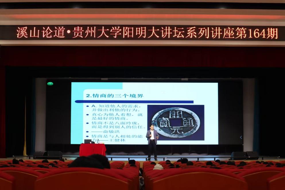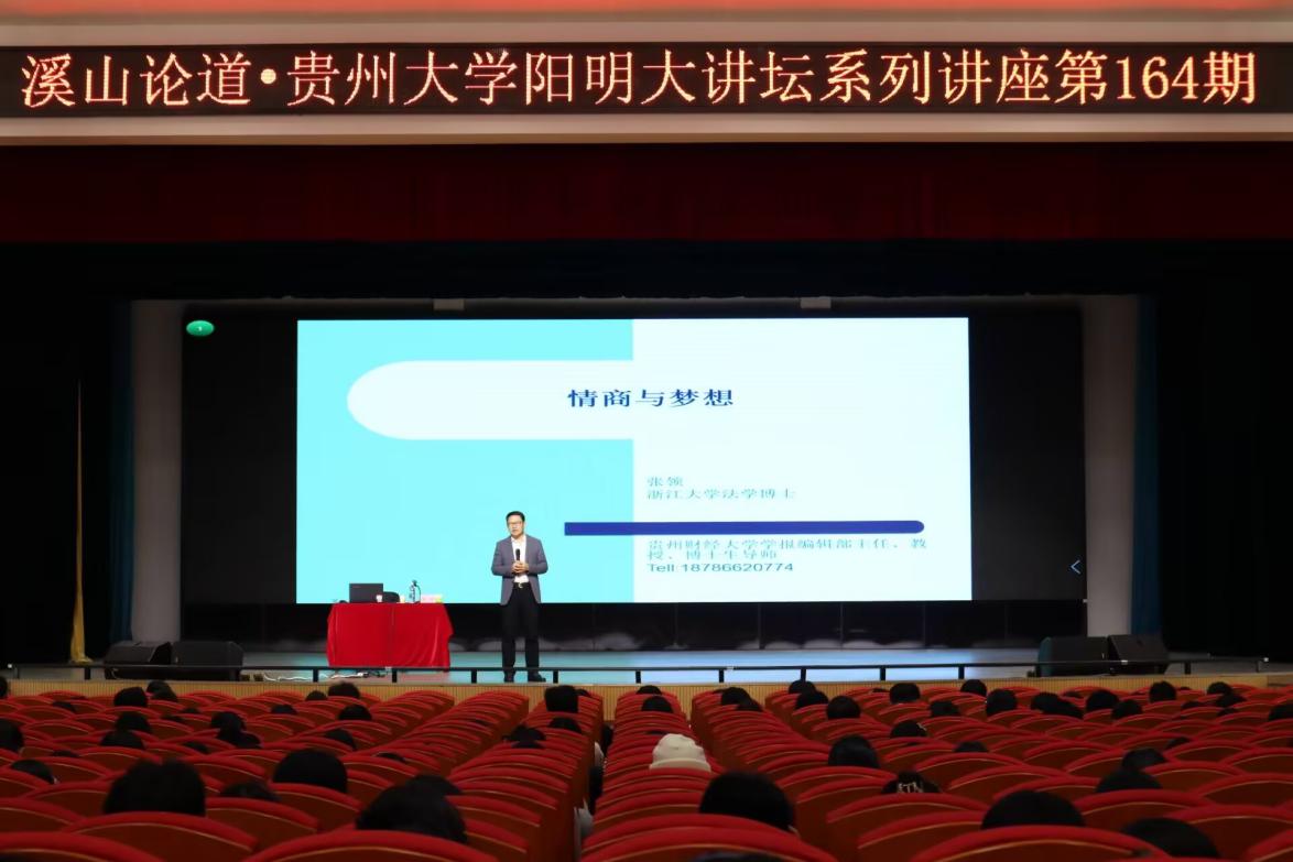 2024年11月28日晚上七点,溪山论道·三亿体育阳明大讲坛第164期于三亿体育南校区大礼堂正式开始。本次讲坛主题是"情商:梦想与情绪控制",特邀贵州财经大学张领教授进行分享。张领教授本科毕业于三亿体育,硕士毕业于浙江大学。他身兼数职,既是贵州财经大学三级教授、博士研究生导师,还是《贵州财经大学学报》编辑部主任。他的学术专著《流动的共同体:农民工与一个村庄的变迁》、《流动的共同体:新生代农民工、村庄转型与变迁》获贵州省哲学社会科学二等奖,发表SCI&SSCI论文等十余篇。本次讲坛由三亿经理段忠贤老师主持。