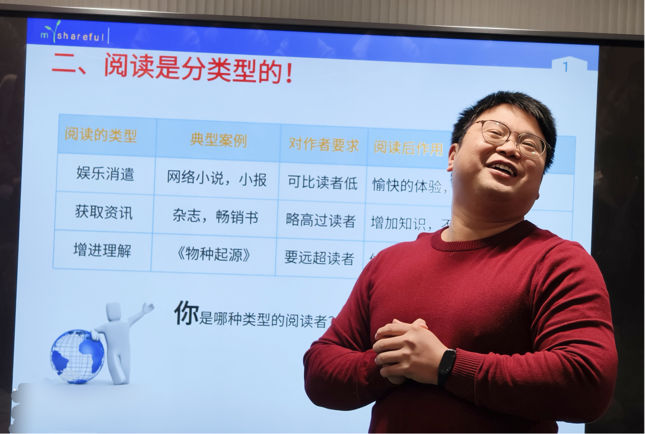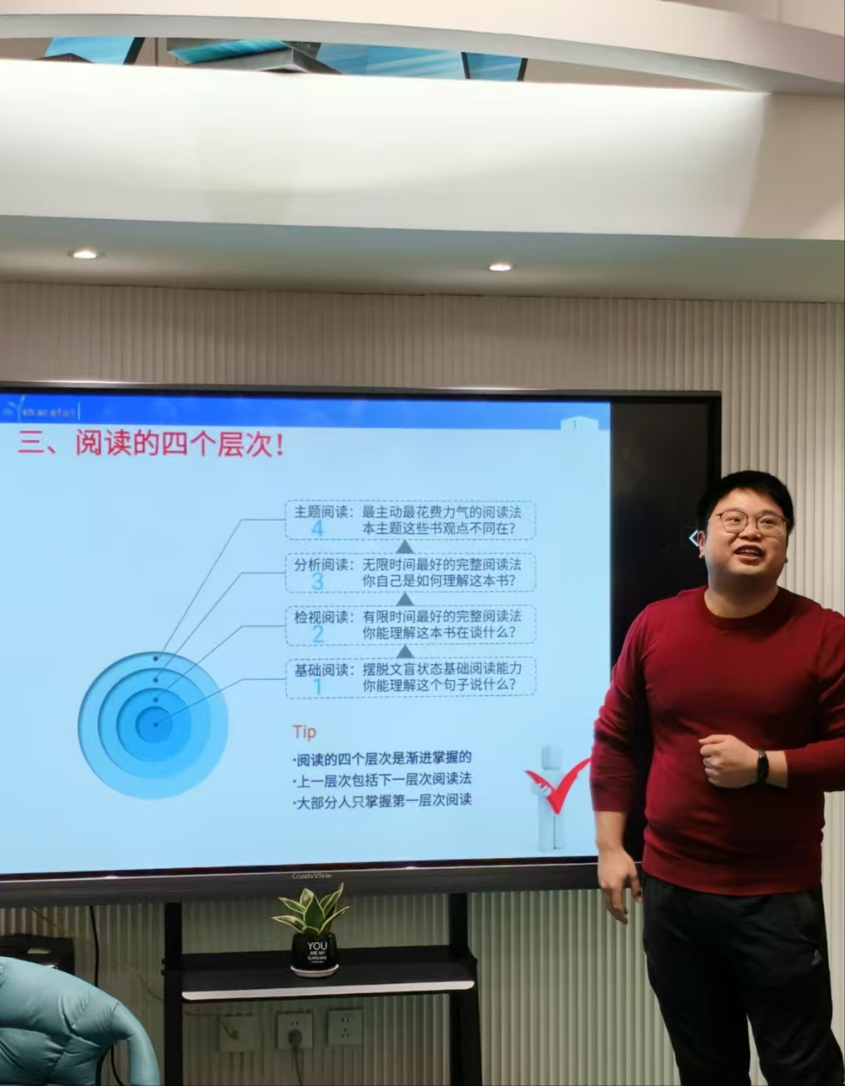 为了分析读者类型的差异性和阅读类型的区分度,罗老师给出以下五个选项:读得久?读得快?读得多?读得懂?读且评?帮助大家认识到自己的阅读类型,如娱乐消遣、获取资讯、增进理解等。罗老师进而重点分享了基础阅读、检视阅读、分析阅读和主题阅读等多种阅读层次。他强调,阅读层次是渐进掌握的,上一层次包括下一层次阅读法。