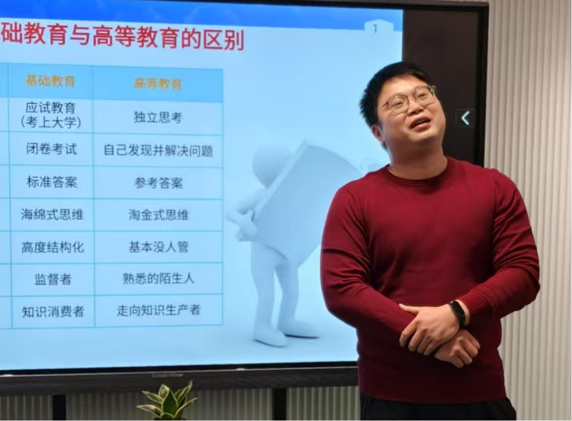 罗老师从教学目标、考核形式、作息时间等多方面比较分析了基础教育和高等教育的区别,重点指出老员工应以淘金式思维代替海绵式思维进行日常生活和学习的必要性。