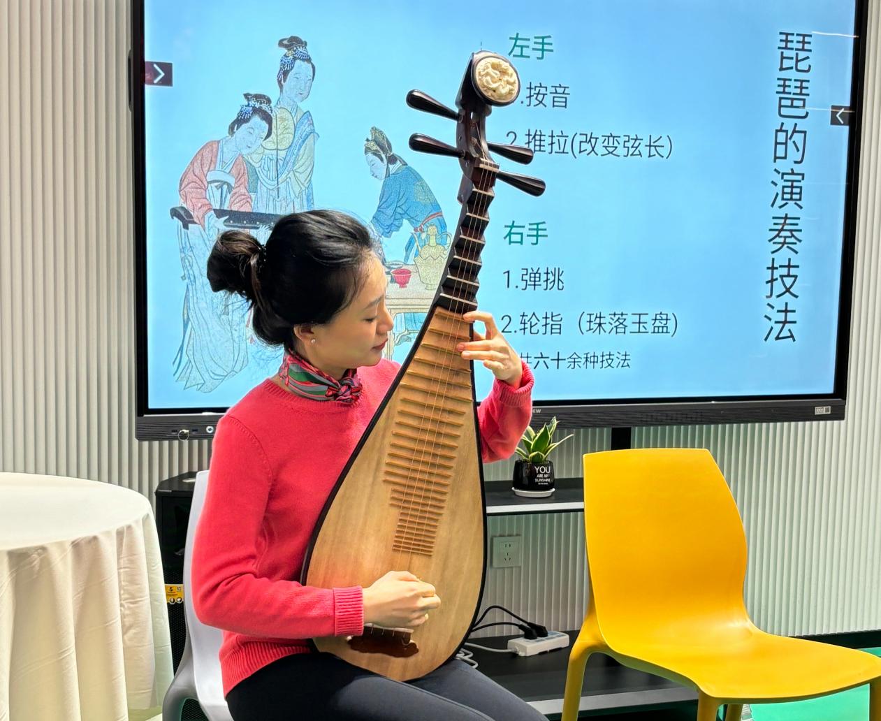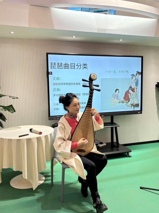 李艺老师还以简洁明了的语言,为同学们讲解了琵琶的相关乐器乐理知识。从琵琶的起源、发展历程、演奏技巧到当代文化中的传承与创新,在同学们面前展开了一幅生动的琵琶历史发展画卷。琵琶,是中国古代传统的弹拨乐器,在长期的发展过程中逐渐形成了具有中国特色的演奏风格和音乐表现力。通过李艺老师的讲解,同学们对原本“陌生”的琵琶乐器,逐渐亲近和熟悉起来,也激发了同学们对琵琶演奏的浓厚兴趣。