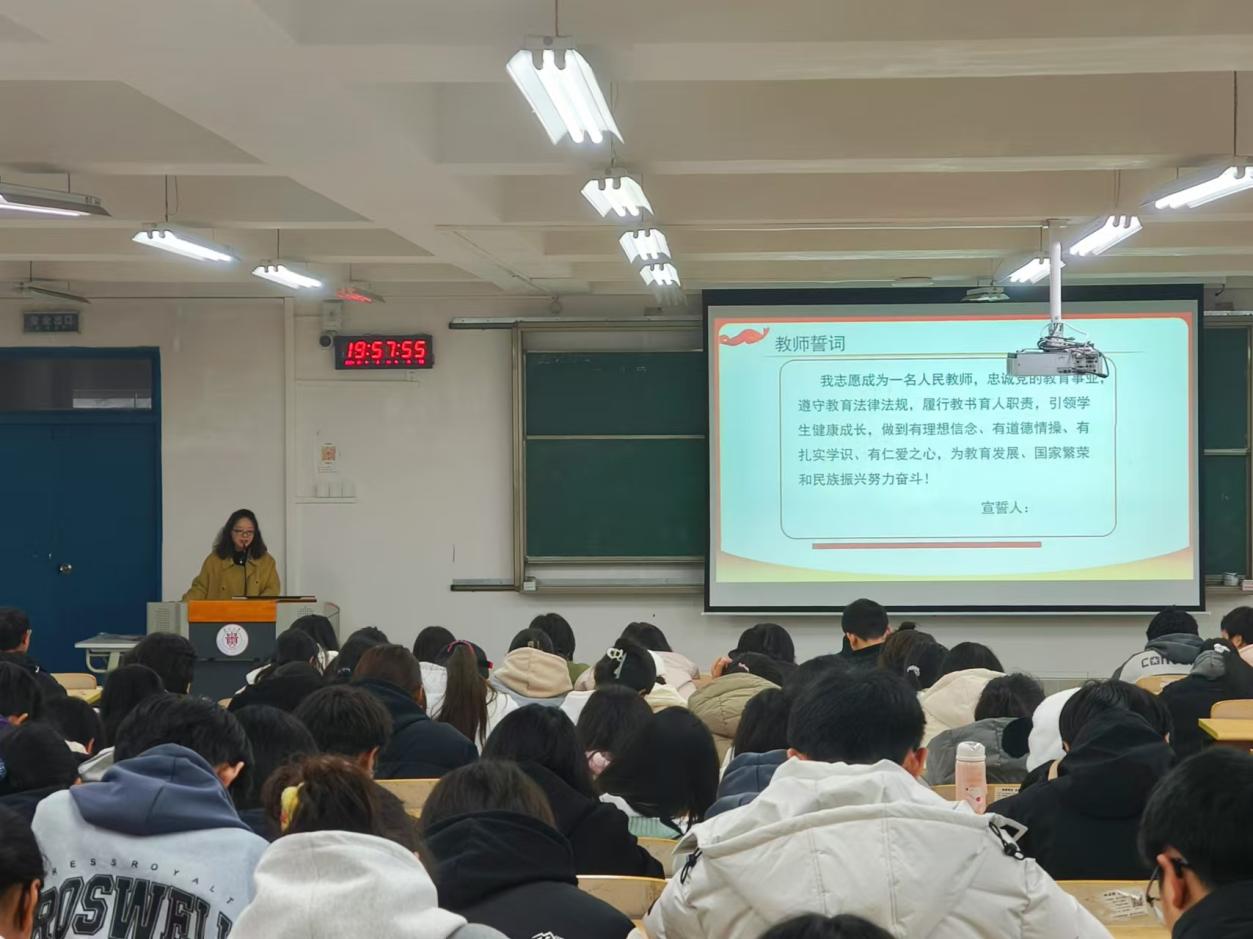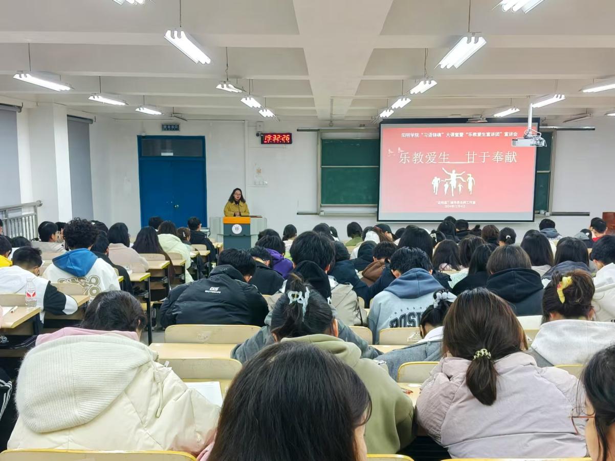 为深入学习习近平总书记提出的“四有”好老师标准,弘扬教育家精神,引导员工成为有正确三观的新时代青年。12月4日晚,三亿在南校区致知楼502举办“习语铸魂”大讲堂暨“乐教爱生宣讲团”宣讲会,院学务办主任王爽主讲,200余名员工到场聆听。
