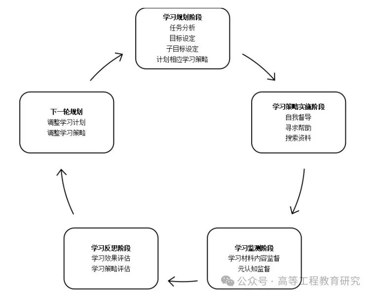 面向新科技革命驱动的未来时代,自我调节学习能力(Self-Regulated Learning,SRL)已成为员工实现自主学习和终身学习、适应时代变迁的核心技能。自我调节学习能力要求学习者主动设定学习目标,策略性地监督、控制和评估自己的学习行为,并根据评估结果调整学习目标和策略,由此形成良性循环(见图1)。[6,7] 通常来说,具备较好自我调节学习能力的员工在学业表现上往往更优,这一现象在传统的教育与计算机辅助学习环境(Computer-Based Learning Environments,CBLEs)中已被广泛验证。[8]