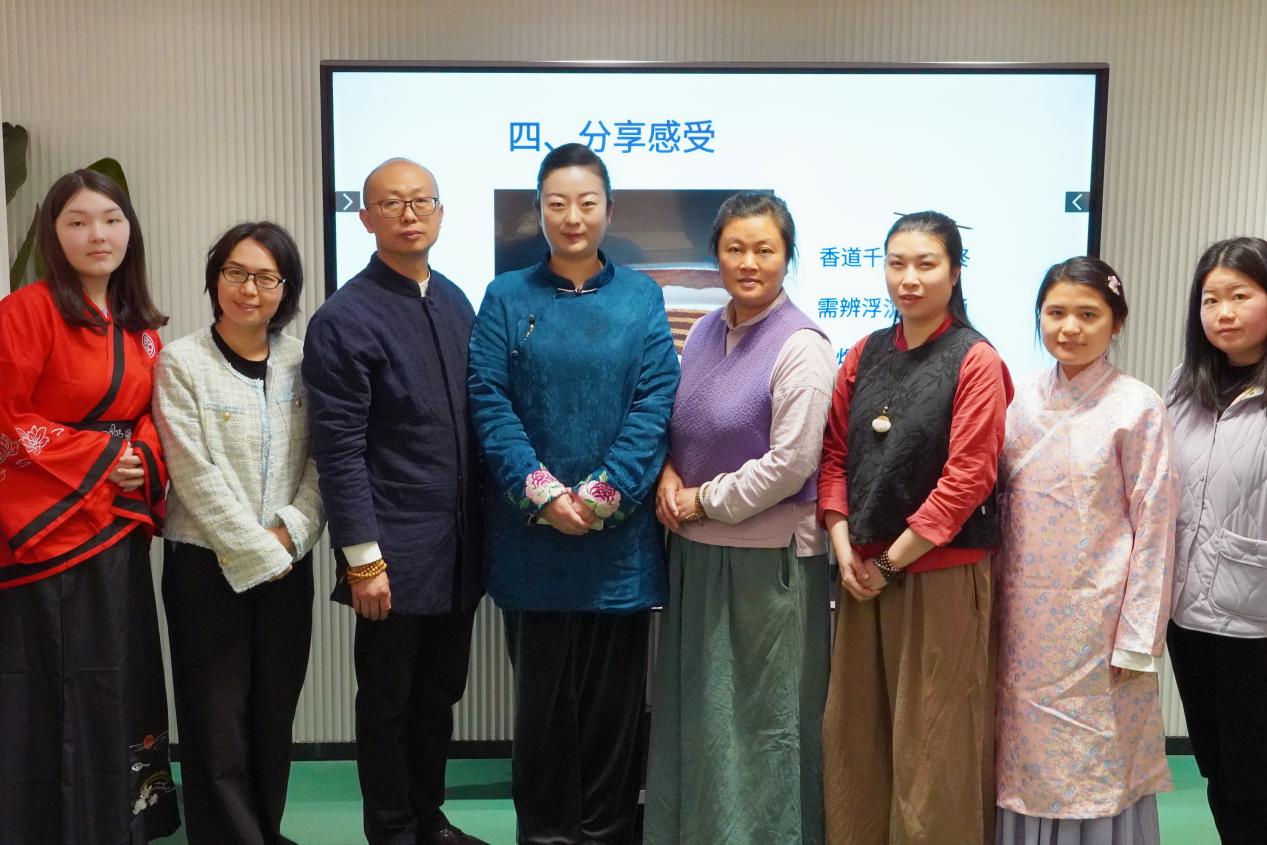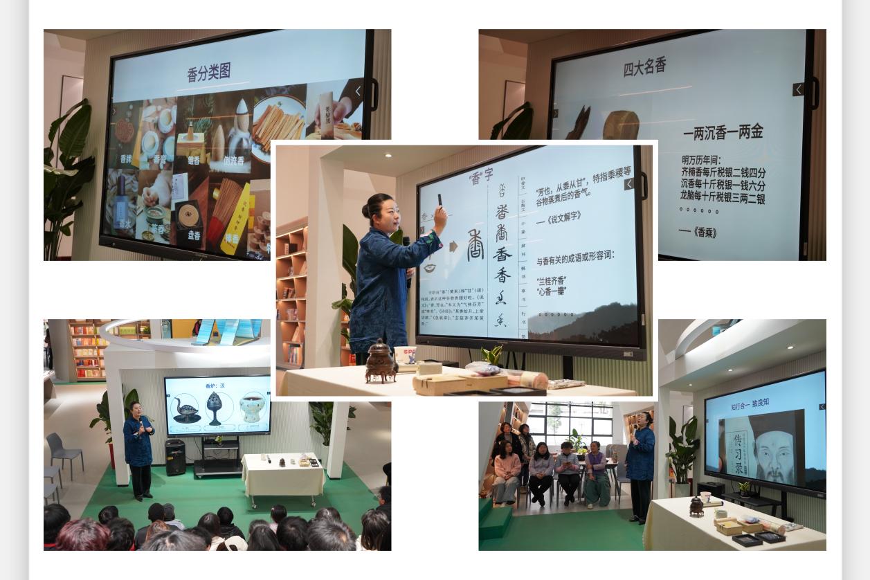 在专题讲座环节,香文化研究专家许璇老师以中外对比为切入点,通过“域外香水与中国香的区别”等互动问题,生动解析了香礼文化的独特内涵。许璇老师的理论讲授分为四个组成部分,一是香礼介绍,二是香的历史文化,三是介绍了香的分类与功能,四是列举了诸多中国典籍中记载的品香雅集活动。她指出:“香礼文化肇始于先秦祭祀礼仪,至宋代形成完整体系,2014年“中国传统制香技艺”入选国家级非遗名录。中国香道讲究‘天人合一’的意境营造,与西方香水强调个性表达形成文化对话,这种差异正是文明多样性的生动注脚。”理论授课尾声,许璇老师以“香道千年证始,需辨浮沉药理通。青烟化蝶衔精魄,一点心灯照古风”的诗句作结,引发全场共鸣。