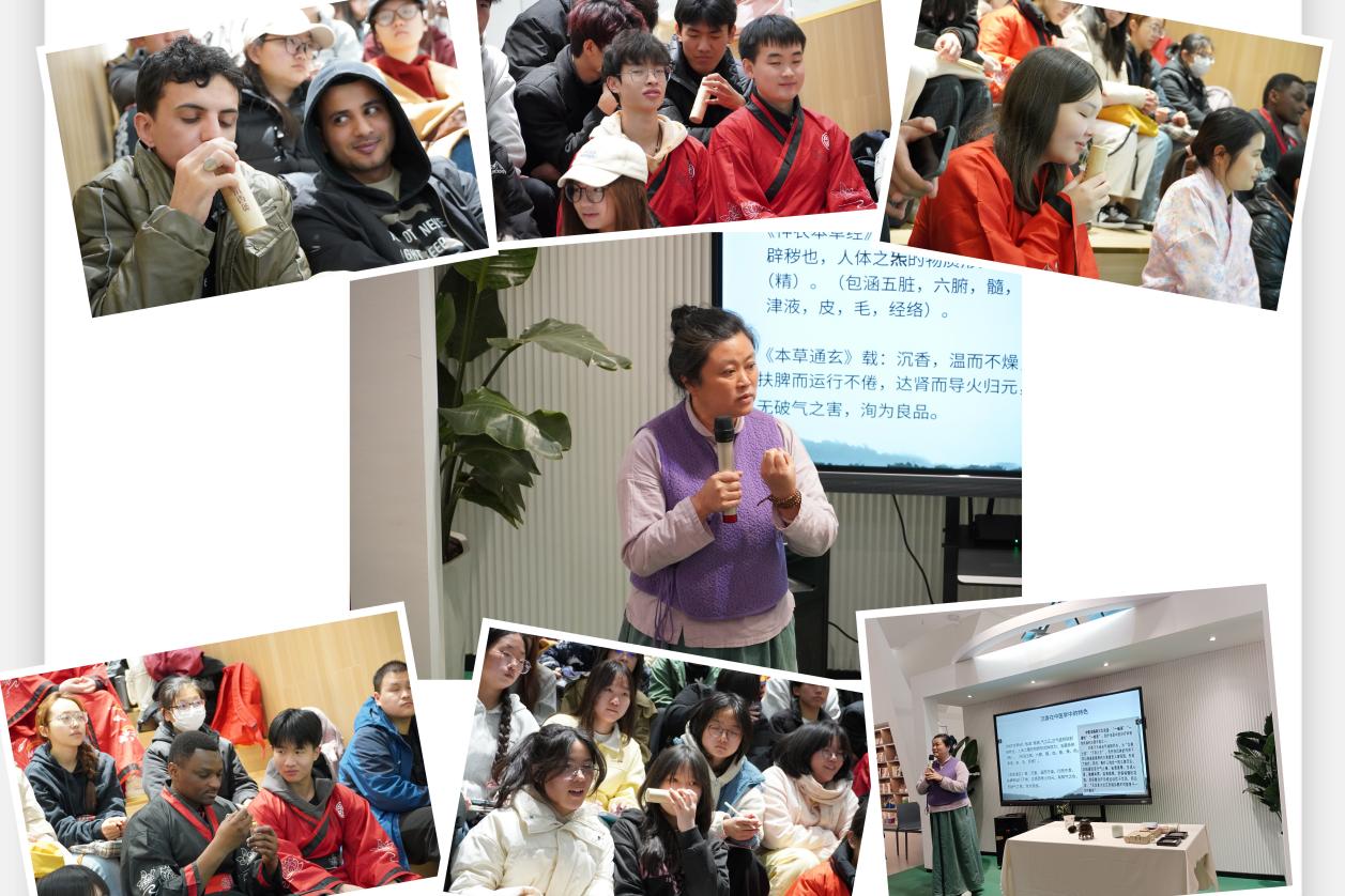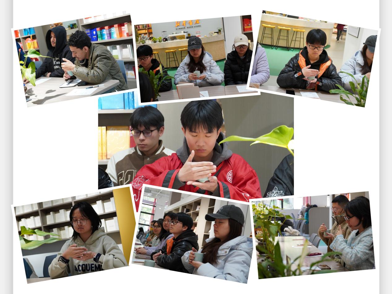最后的实践环节将活动推向高潮。活动现场青烟袅袅,参与者凝神静气,切身感受香道“静心养性”的精神内核。专业行香师香凝现场演示了隔火熏香的传统技艺与品香方式,中外学子在古琴韵律中体验品香礼仪,并填写了自己的香笺卡片。期间,香凝老师特别设置“闻香知健康”互动环节:通过多种香的反复比对,唤醒大家身体的知觉,引导大家提升到“身心疗愈”的生命境界。