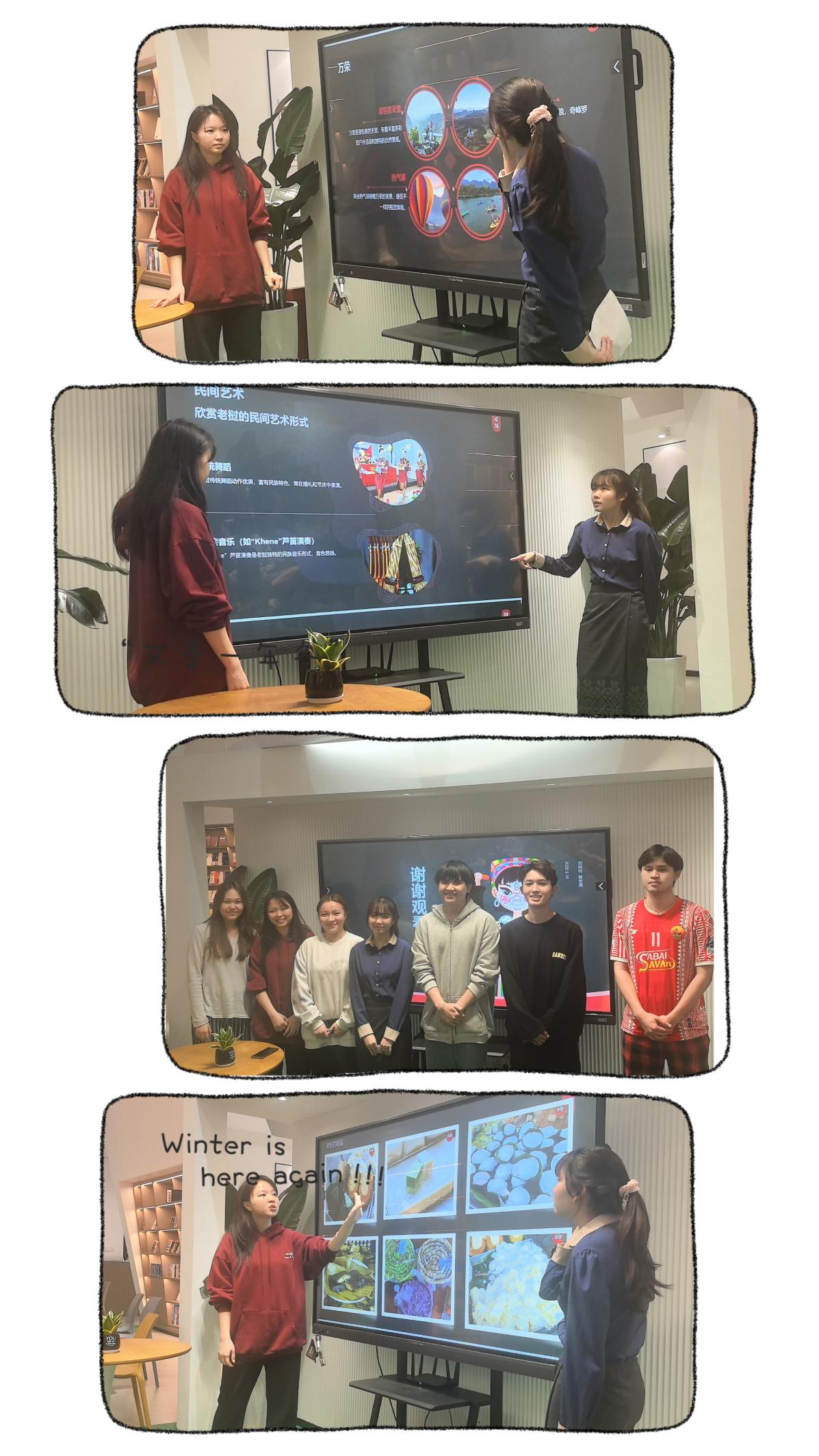 老挝员工刘阿玲和韩安琪身着传统服饰,热情分享了老挝的服装、美食、城市分布、自然风光及服装服饰和艺术风情,其中重点介绍本国境内的三大世界遗产——瓦普寺、查尔平原巨石遗址和琅勃拉邦古城,赢得阵阵赞叹。分享结束,她们与其他来自老挝同学一同合影留念,那画面定格的不仅是欢乐的瞬间,更是中老文化交流的美好见证。