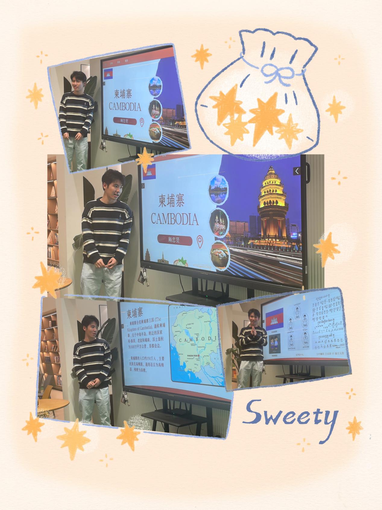来自柬埔寨的赖忠贤同学通过图文并茂的展示,介绍了柬埔寨的地理、民族、礼仪、节日、舞蹈、美食及语言文字和国家代表艺术作品。其中,他对“S21监狱博物馆”的讲述,引发了大家对柬埔寨国家历史的好奇与思考。
