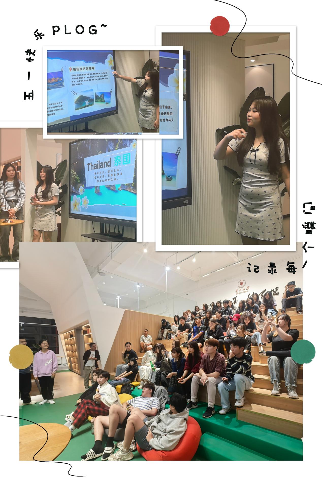 来自泰国的刘芳欣和谢小满两位同学通过生动的视频影像,从泰国舞蹈的传统技艺到水灯节的浪漫习俗,全方位展示了泰国的文化特色。当大屏幕上出现冬阴功汤等美食和清迈天灯节的壮观画面时,现场响起阵阵赞叹声。“希望有机会能带大家亲自体验泰国的泼水节”,马维芳热情地发出邀请,“感受我们‘微笑之国’的热情好客。”这番介绍不仅让现场观众对泰国旅游文化充满好奇,更激发了大家对跨文化交流的浓厚兴趣。