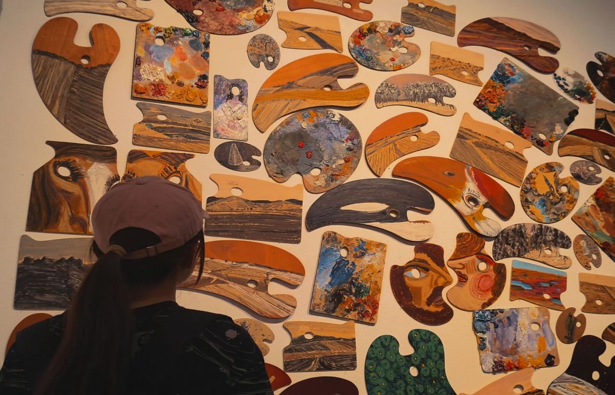 而《调色板上的风景》系列则以30×40cm的微缩木板为载体,将油彩转化为灵动的诗意符号,在有限的空间里营造出无限的艺术意境。著名艺术家杜大恺对该系列作品给出了高度评价。他指出,田卫平践行了吴冠中先生“油画民族化”的追求——调色板上混沌无序的色彩经其重组,竟透出宋人青绿山水的悠远韵味;而刮刀挥洒的率性线条,又与书法飞白的神韵遥相呼应,展现出一种跨艺术的“联动”。学子们围聚在这些“微缩宇宙”前热烈讨论:有人从一抹钛白中读到雪落黑土的寂静,有人却在靛蓝漩涡里看见贵州山岚的变幻。恰如带队教师朱小明老师的点悟:“这哪是调色板?分明是东方写意与西方油彩的‘私语’,是艺术家向日常物俯身时发现的史诗。”