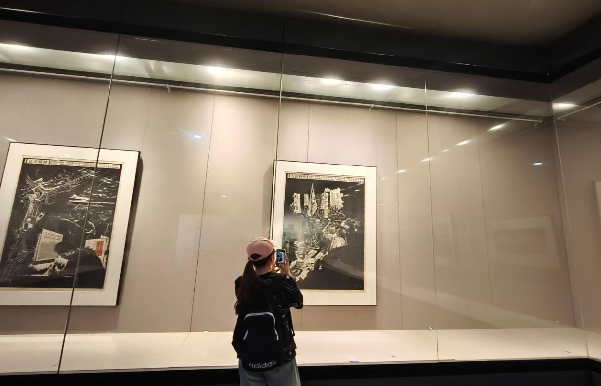 展厅一角,作品《单向度的光》,出自艺术家李晟东之手,他以冷峻的刀法,对现代工业文明背后的孤独和疏离进行了解构。铝板蚀刻的金属光泽与阴影相互交织,形成强烈的视觉张力。“每一道刻痕都是手工的温度,”版画社成员王颖触摸着梨木雕版说道,“就像我们诵读的典籍,字里行间留存着古人的体温。”工作人员介绍,这些作品不仅是当代艺术家的独特思考和创新表达,更延续了徐悲鸿于1940年代在贵州的探索精神——大师曾五赴贵阳,发现当地土纸“吸墨力强、纸质坚韧”的优势,开创了中国画材料革新的先河。