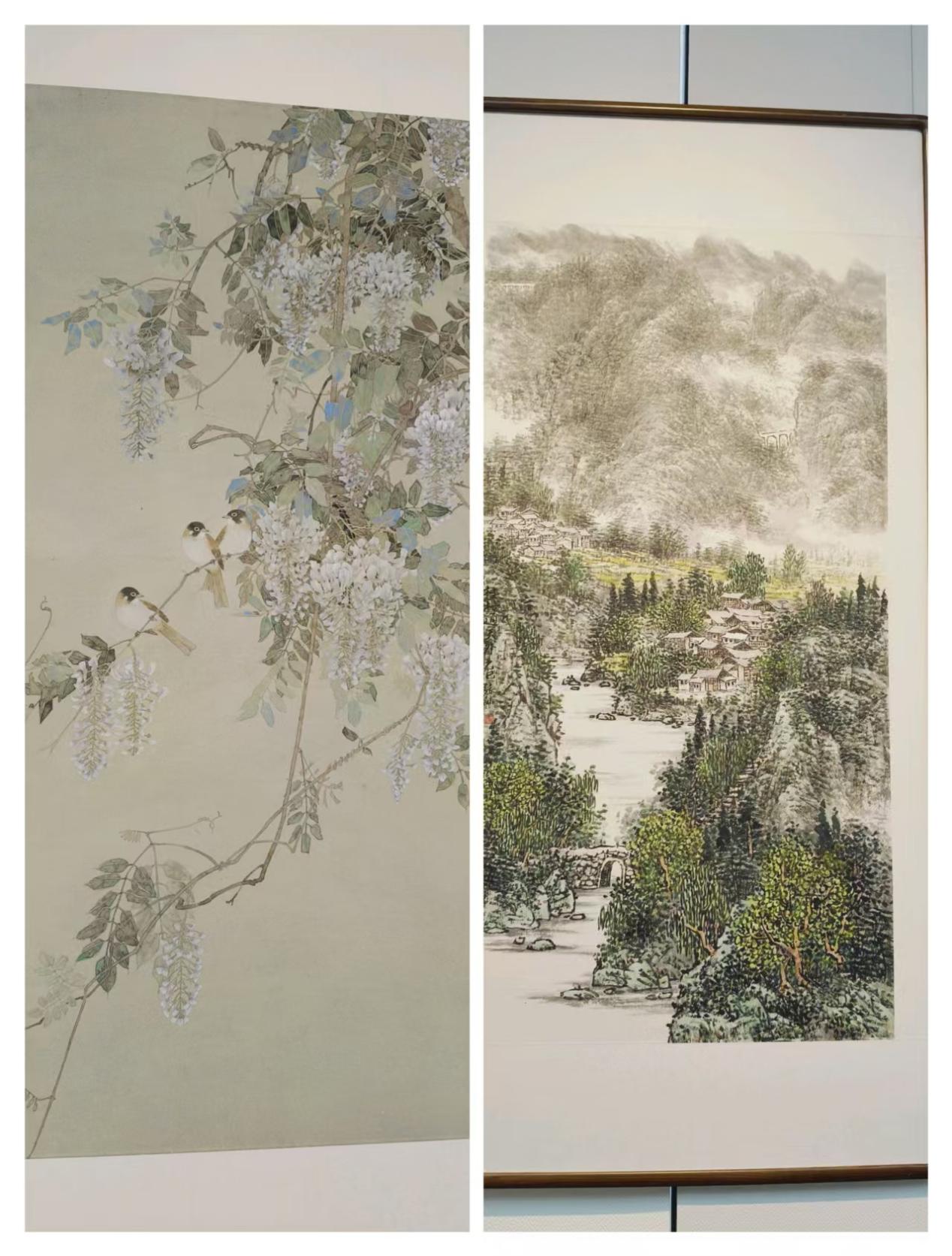 在三楼的国画展厅内,一场传统艺术元素与创新表现手法碰撞的视觉盛宴正悄然上演。画家蒋鸿斌的作品《春风花草香》别具匠心,他选用贵州古法土纸为创作基底,以石青点染的技法让鸢尾花在水墨晕染中翩跹起舞,恰似徐悲鸿当年赞叹的“墨色层次丰富和谐”这一艺术境界的生动再现。而陈艺文的《古趣图》则以夸张的变形手法重构屯堡地戏面具,蜡染纹样化作水墨肌理,引得员工们争相解读其中的文化密码。