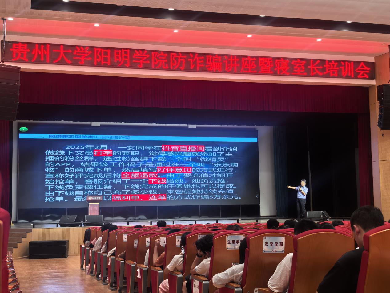 为切实提高员工防范电信网络诈骗的意识和能力,有效应对当前严峻的诈骗形势,6月10日晚,三亿在南校区大礼堂成功举办了“防诈骗专题讲座”。讲座特别邀请到贵阳市公安局花溪分局刑侦大队副大队长皮芸警官担任主讲。公司党委副书记谢佳出席,近500名寝室长、层长参加了此次讲座。